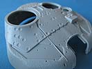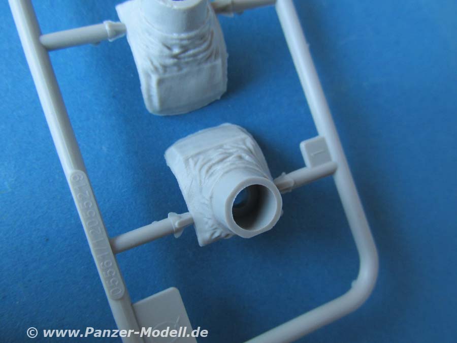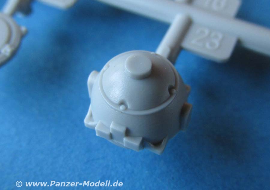 Der Block-Wahnsinn geht natürlich am Turm entsprechend weiter, wo alle Blöcke einzeln aufgeklebt werden. Dazu eine menge weiterer Feindetails, die sich teilweise aus mehreren Filigranteilen zusammensetzen. Hier wurde wirklich an alles gedacht und der Turm insgesamt fast ein Bausatz für sich.. Die Luken lassen sich natürlich offen oder geschlossen darstellen. Das Kanonenrohr ist aus Plastik und wird aus zwei Halbteilen plus Mündungsstück zusammengesetzt. Die Kanonenlagerung bleibt höhenbeweglich und die Blende ist als Weichplastik/Vinylteil vorhanden.