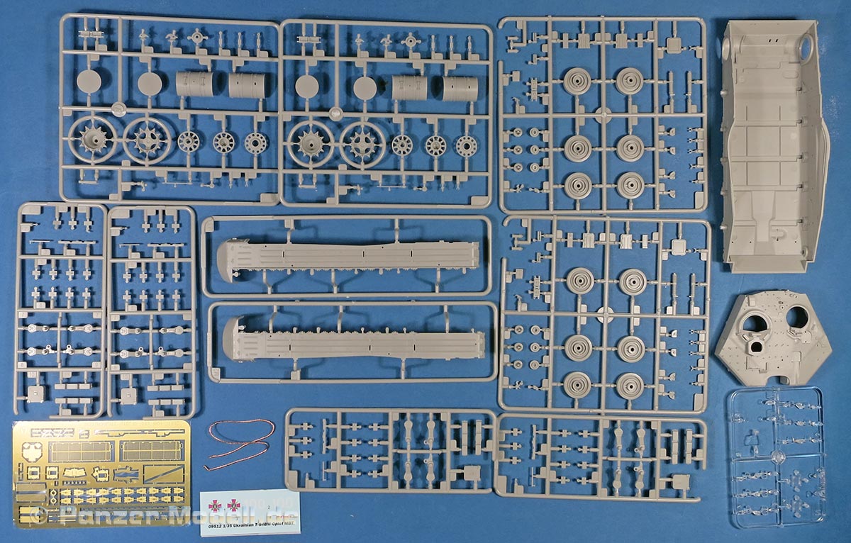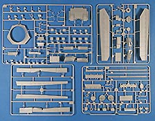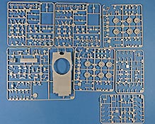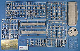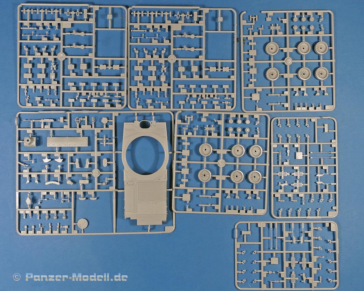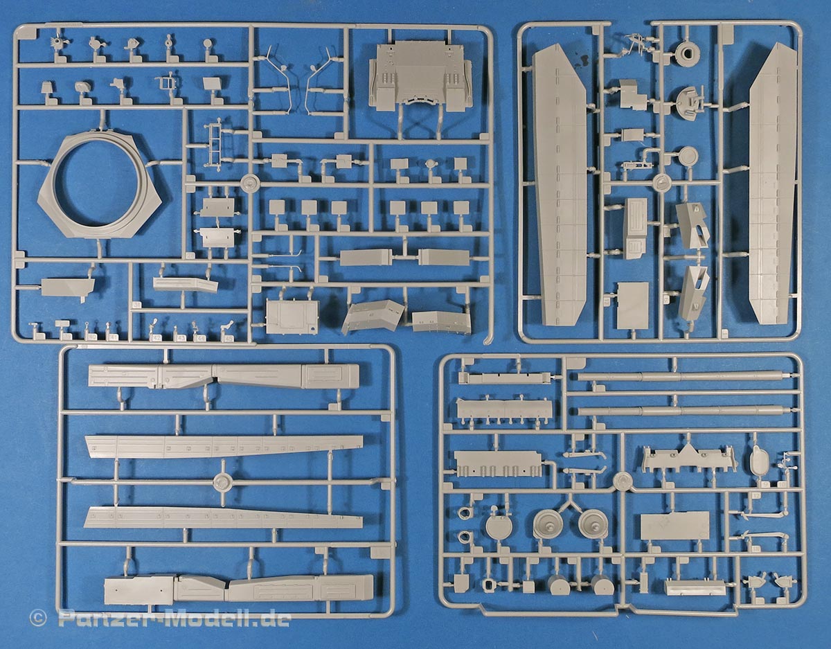 Im Karton finden sich 21 graue Spritzlinge, 4 rotbraune Spritzlinge, einen klaren Spritzling, die Unterwanne, Turmoberteil, verdrilltes Kupferkabel, eine PE Platine, und ein Decalbogen.