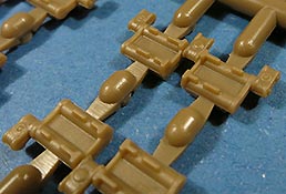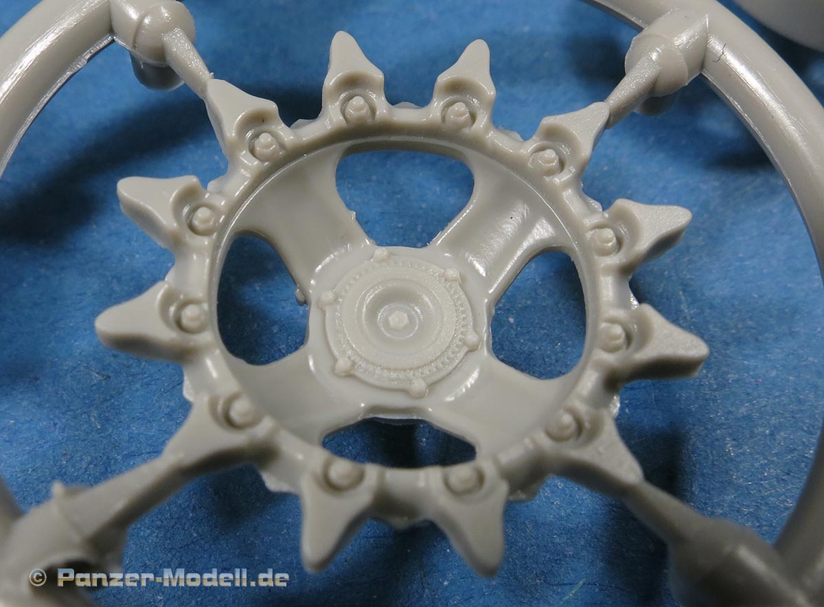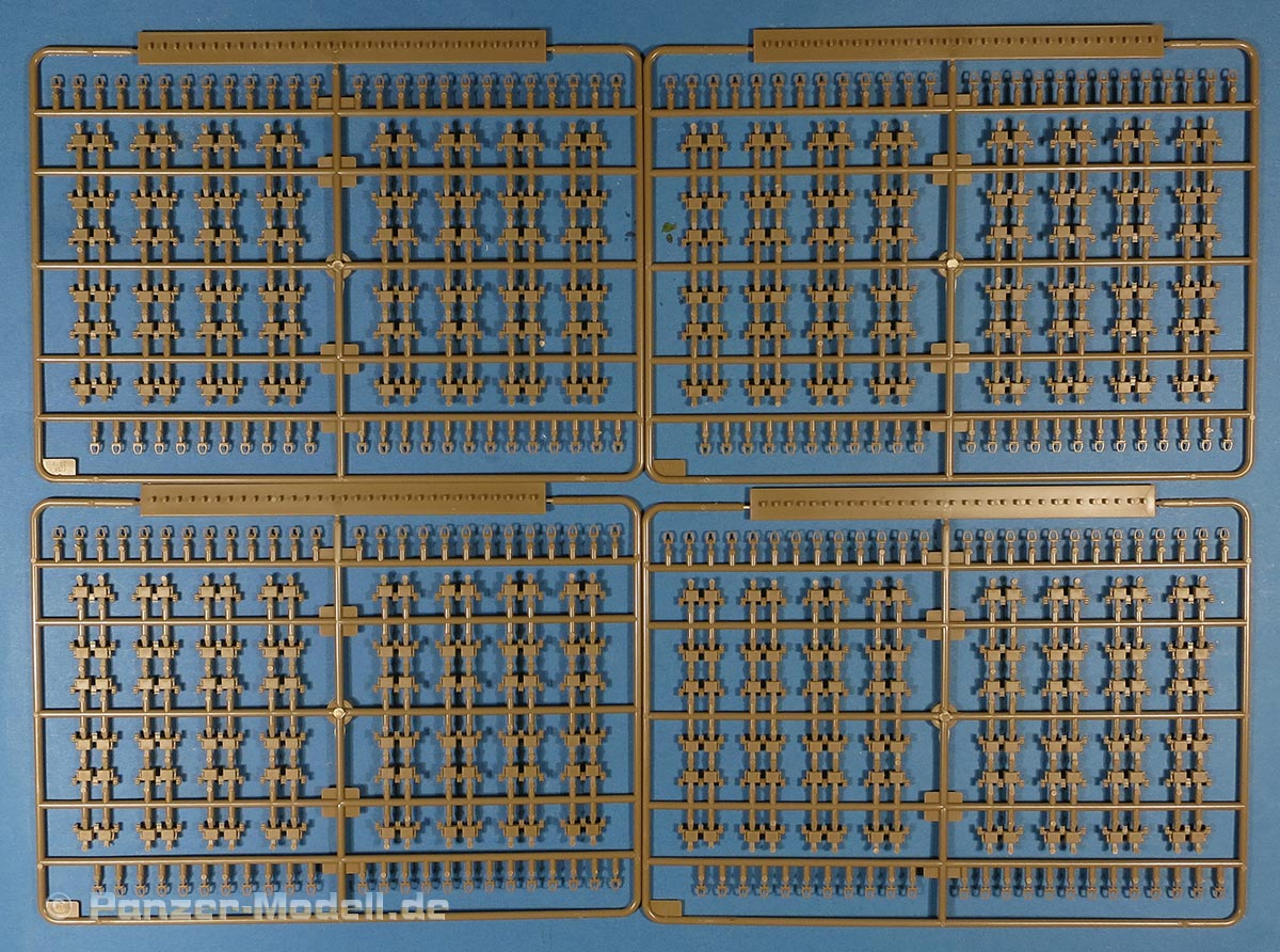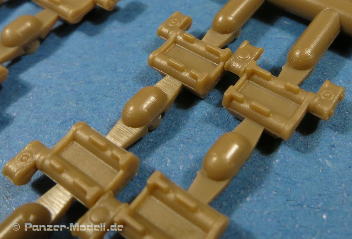 Die Glieder an sich sind als Stahlkette ohne Polster mit schönen, scharfen Details und erfreulicherweise ohne Auswerferstellen. Die Endverbinder sind mit angegossen, was im Bereich er Umläufe optisch ein wenig problematisch ist, denn der Endverbinder müsste sich an beiden Gliedern etwas anwinkeln, was durch den Anguss an ein Glied nicht der Fall ist.