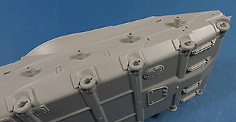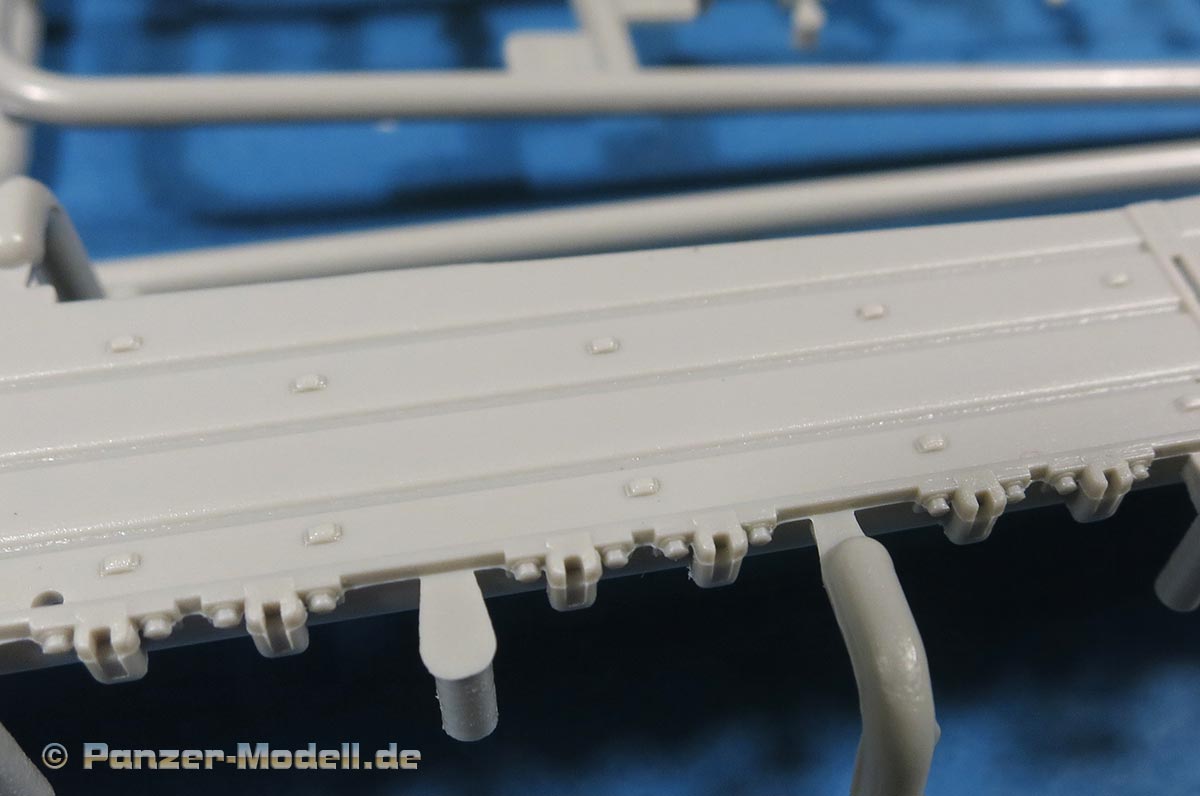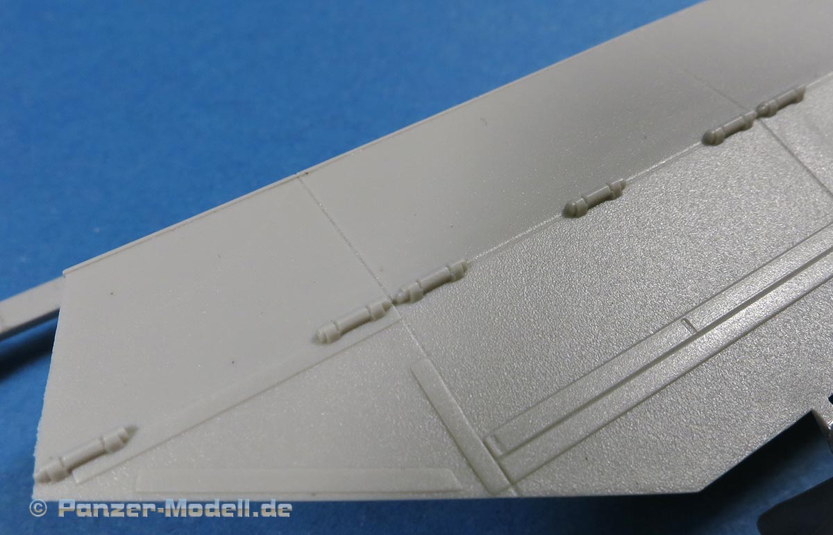 Die Kettenbleche liegen einzeln bei, werden aber massiv mit Staukästen und den dicken Zusatzpanzerelementen versehen. Die Darstellung der Details ist auch hier sehr schön und fein mit Scharnieren, Versteifungsrippen, Nieten und Aufstiegshilfe aud PE Blechen am Heck.