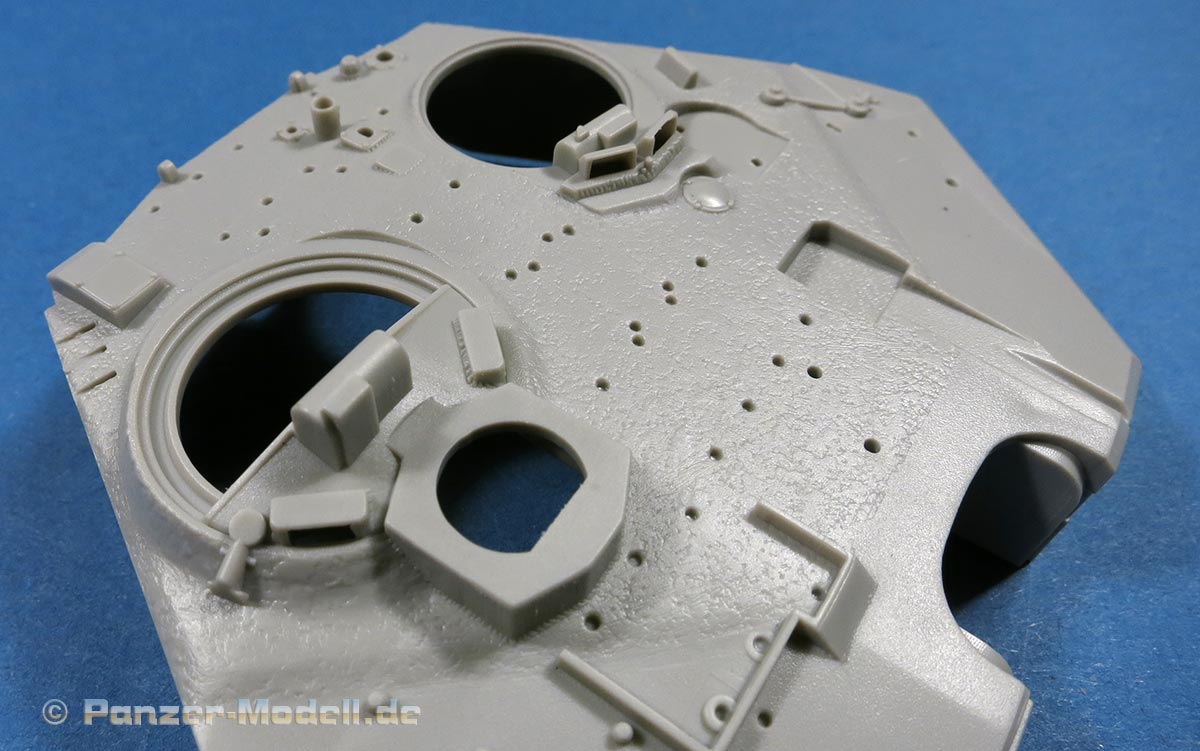 Der Turm setzt sich grob aus Ober- und Unterteil zusammen - auf dem Oberteil finden sich auch bereits schon viele schöne Details angegossen, wie auch sehr schöne raue Gussstruktur und scharfe Positionslöcher mit eingegossen sind, die für die Zusatzpanzerelemente.