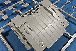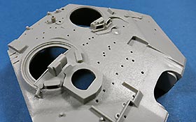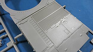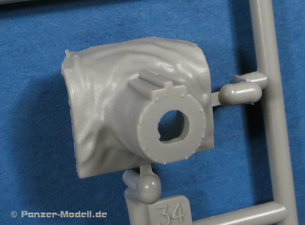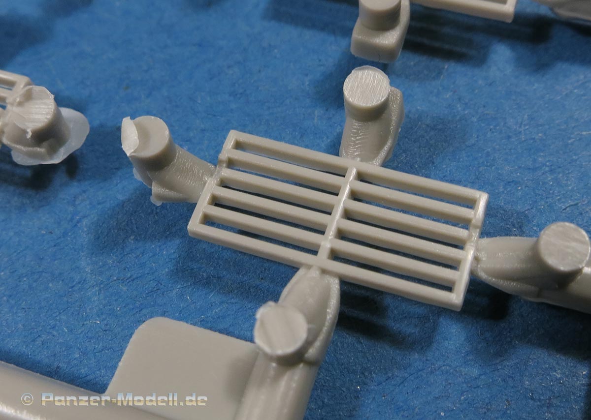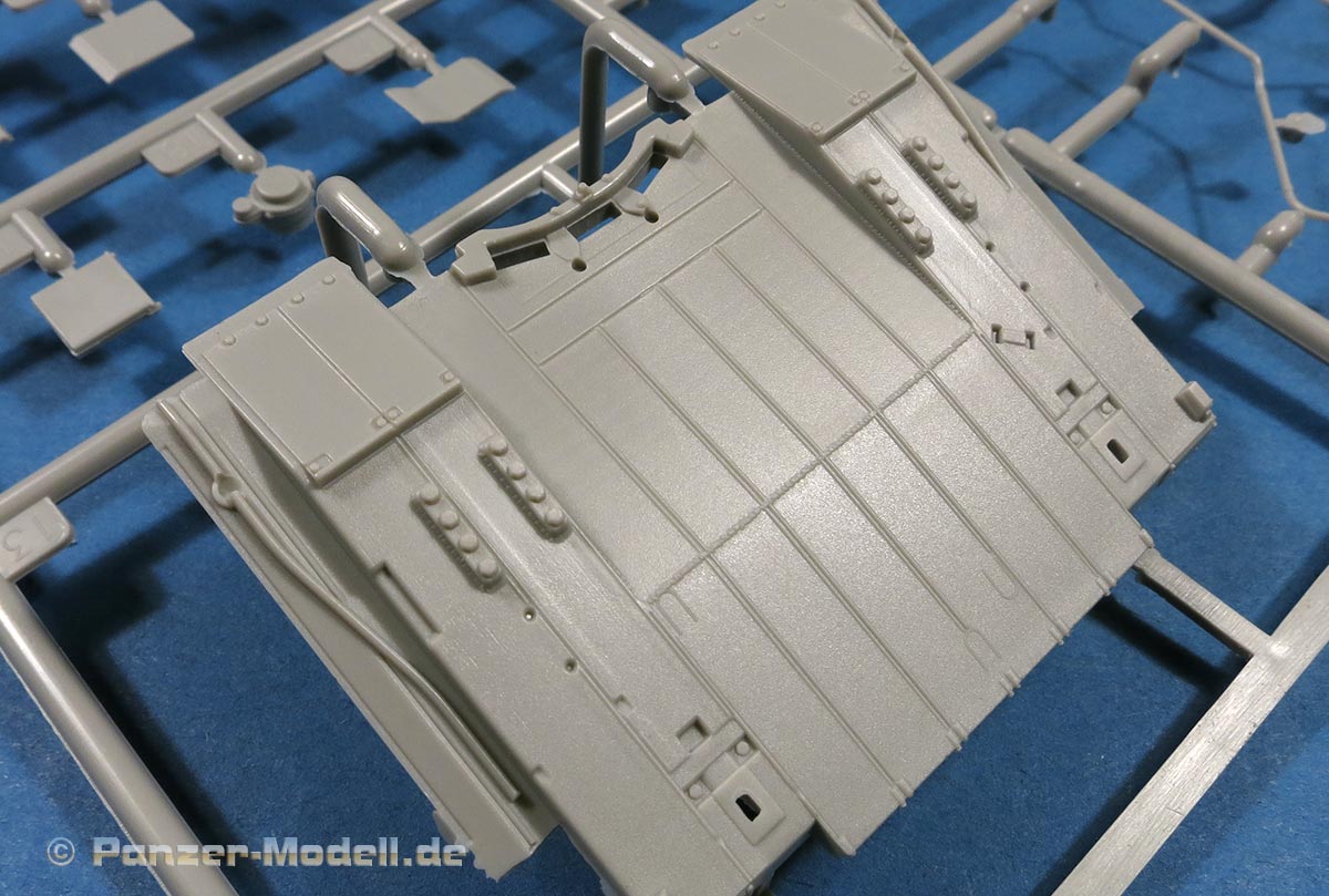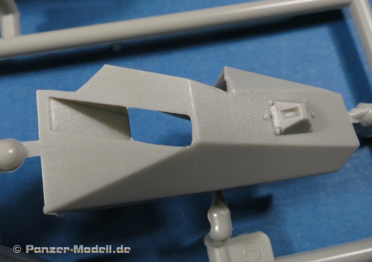 Die Oberwanne ist mit Motordeck und Turmdrehkranz einteilig. Die Motorraumluken sind geschlossen gegossen, nur die Fahrerluke ist offen dargestellt. Über die Lüfterlamellen des Motorraums kommen sauber und fein geätzte PE Gitter. Die Glacisplatte wird einzeln angebracht und besteht aus einem Stück mit feinen Details an Schweißnähten, Fugen und Bolzen. Die Lampenschutzbügel sind aus Plastik in jeweils einem Teil gespritzt - das sieht richtig gut aus und erspart fummelige Arbeit.