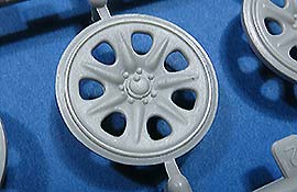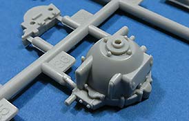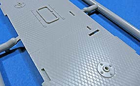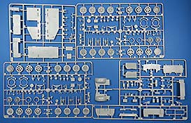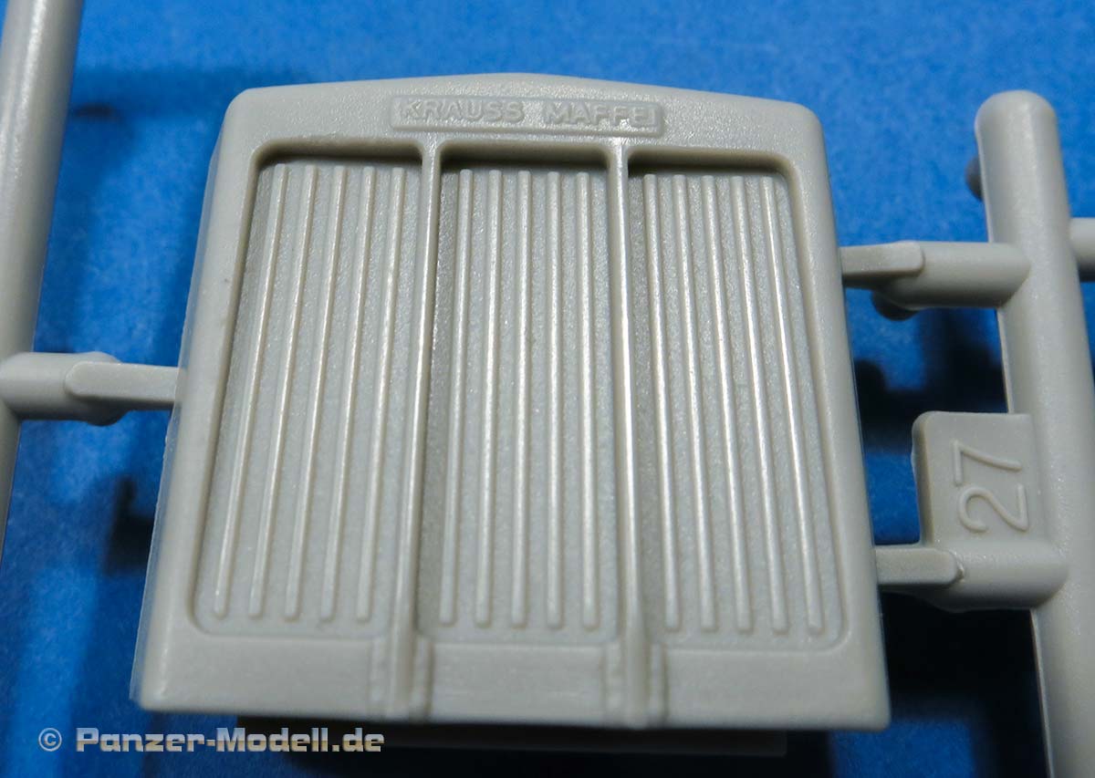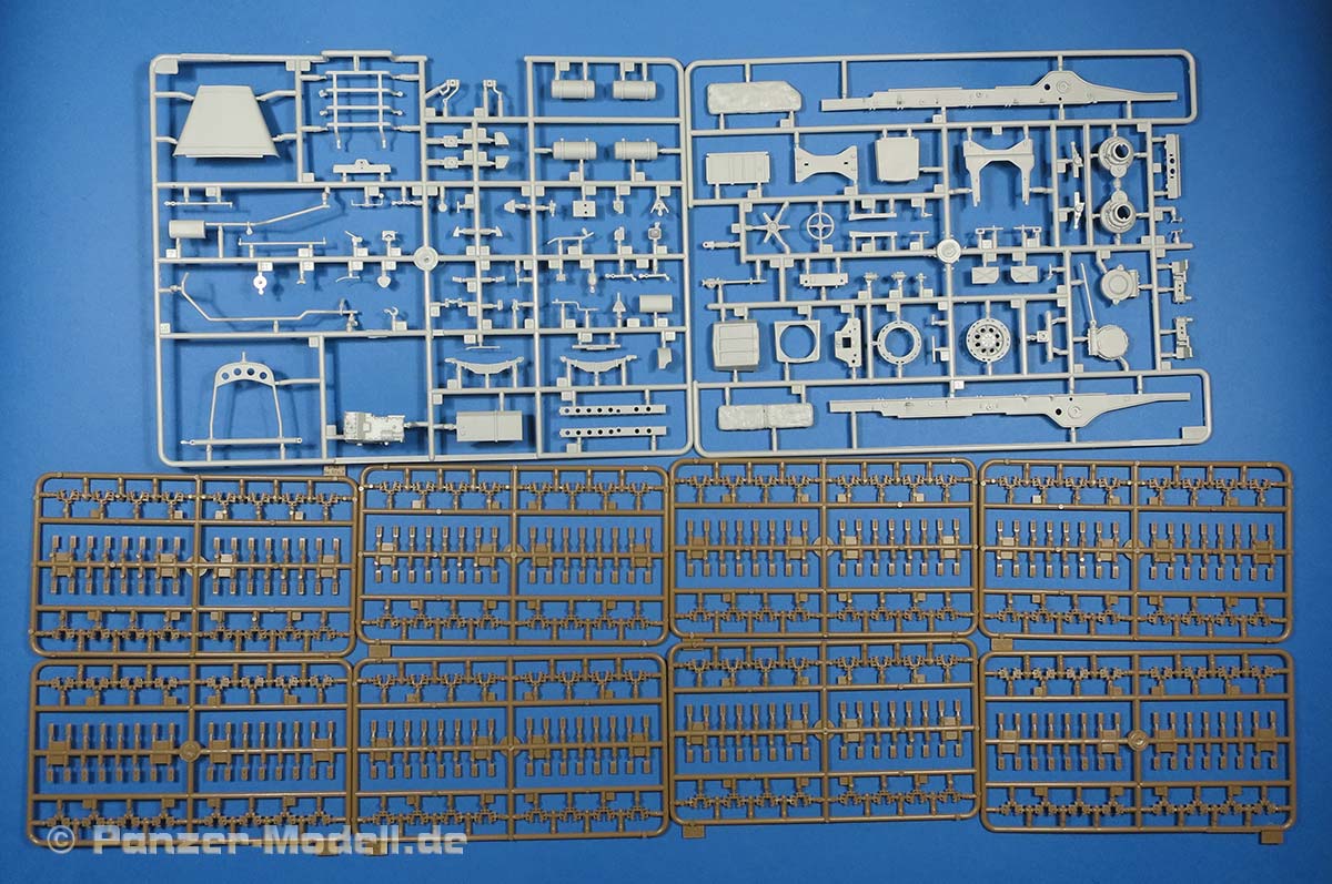Die Achse der Antriebsräder und der große Getriebeblock stellen ebenso wie die Halterung der 3 Druckluftbehälter einen Teil der Querverstrebungen dar. Das Schachtellaufwerk wird, wie schon angesprochen, von seitlich am Rahmen befestigten Blattfedern abgefedert. Die Laufrollen bestehen aus 6 Paaren pro Seite, die äußeren mit Speichenfelgen, die inneren mit Lochfelgen. Die Spannräder haben auch Speichenfelgen, sind aber zusätzlich mit Bolzen zwischen den Rädern zur besseren Führung der Kette versehen. Die Qualität der Räder ist sehr gut mit feinen Details. Das Laufwerk selber wird geklebt und bleibt nicht beweglich. Die Einzelgliederkette besteht aus den eigentlichen Gliedern und aufzuklebenden Kettenpolstern mit feinen, sauberen details und ohne Auswerfermarken. Bei sparsamem Umgang mit Klebstoff erhält man eine vollbewegliche Kette, was bei dem geklebten Laufwerk nur insofern Sinn macht, als dass es das Aufziehen der Kette später erleichtert.