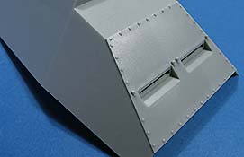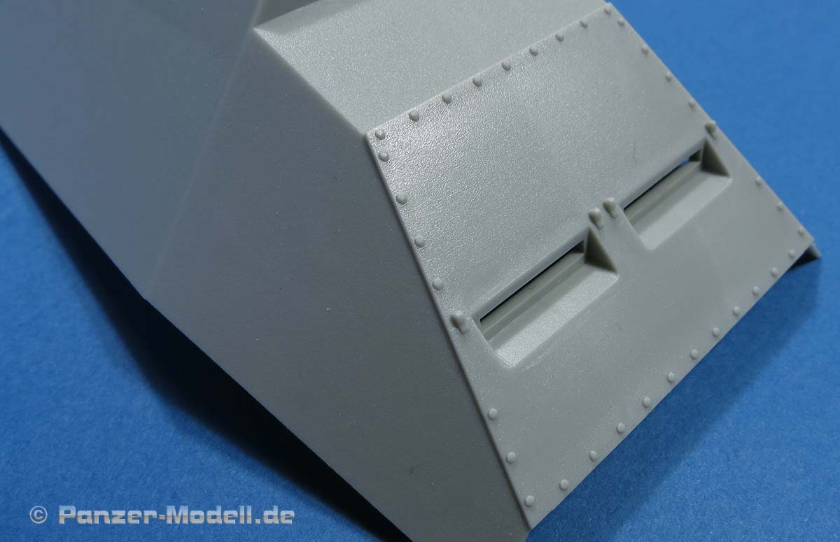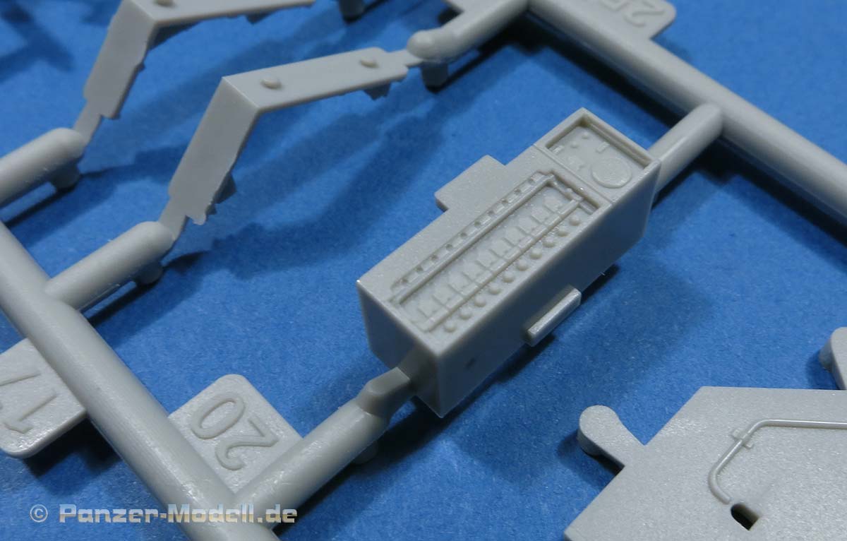 Die Bodenplatte weist ein schönes Riffelblechmuster auf und ansonsten wird tatsächlich einiges an Inneneinrichtung dieses Feuerleitaufbaus geboten, wie Schalttafeln, Verteiler, Staukisten, Sitze, Armaturen und sogar einen Arbeitstisch mit einem Feldfernsprecher mit Telefonhörer, einer Lampe und sogar einer Ablage mit Aktenordnern!