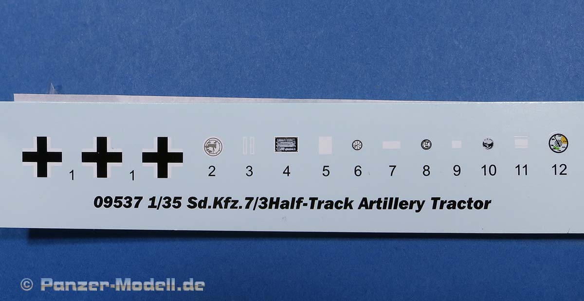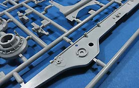 Wie schon den anderen Sd.Kfz.7 Bausätzen von Trumpeter besteht der Rahmen aus separaten Längs- und Querträgern. Der vordere Querträger nimmt die Blattfeder der Vorderachse auf. Diese kann beweglich gebaut werden, um die Querneigung je nach Gelände aufzunehmen. Radlager und Lenkgestänge können so angebaut werden, dass man einen Lenkeinschlag darstellen kann.