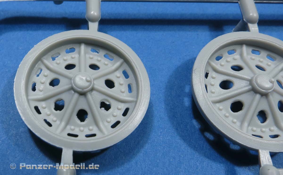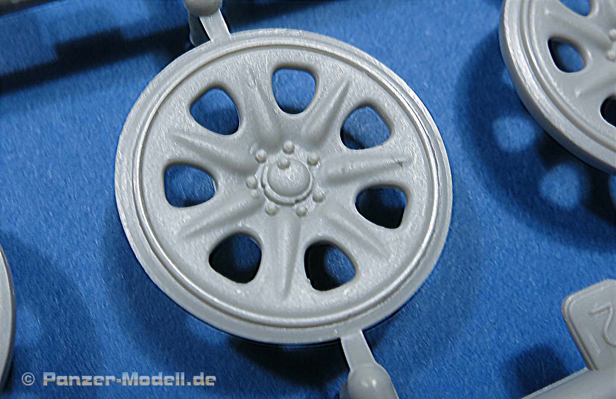 Die Vorderräder bestehen aus Speichenfelge, innerem Felgenring und schwarzen Vinylreifen, welcher mit sauberem Profil, aber leider ohne Hersteller-/Reifengrößenaufdruck daherkommt.