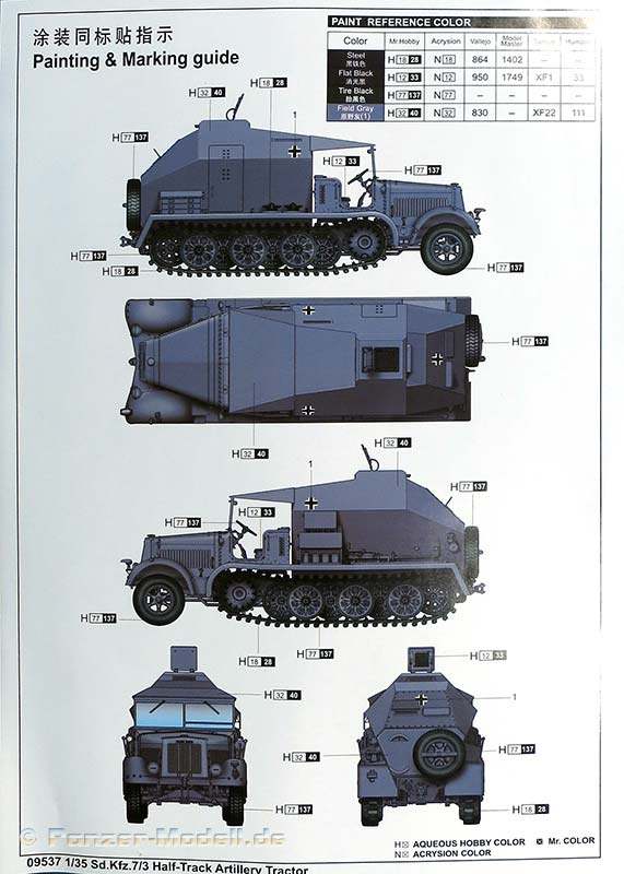 Auf einem farbig gedruckten A4 Zusatzblatt ist die Anbringung der Decals und die Bemalung beschrieben. Farbangaben werden für die Marken Mr. Hobby, Acrysion, Vallejo, Model Master, Tamiya und Humbrol gemacht.