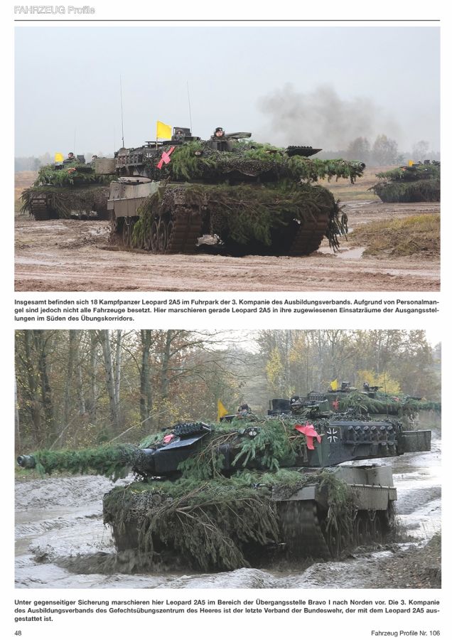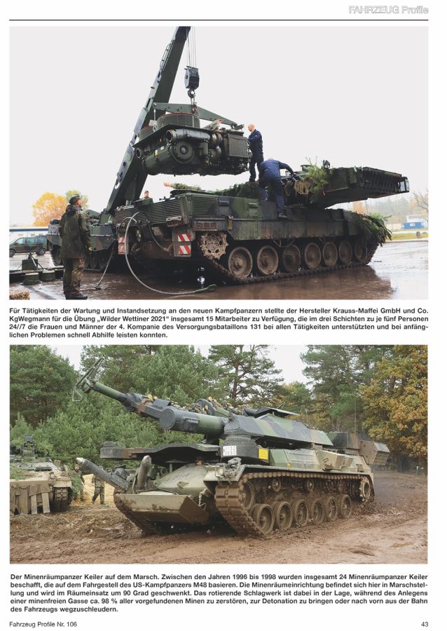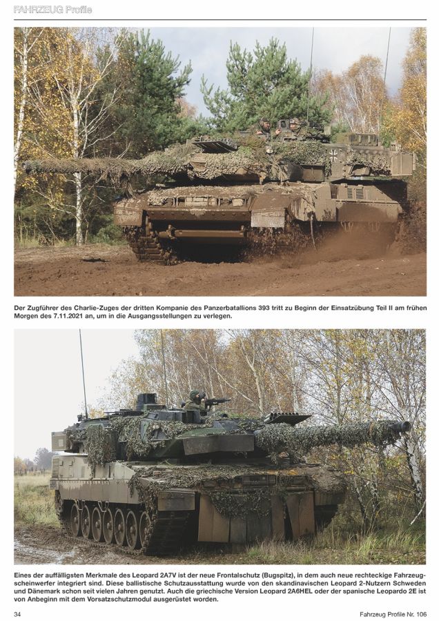 Die gestochen scharfen, großformatigen Fotos zeigen die Fahrzeuge fast ausschließlich in NATO-Dreifarbtarnung, von der aber oft nicht viel zu sehen ist wegen der starken Verschmutzung und der Tarnung mit Zweigen, Tarnnetzen und anderen Materialien. Ausgenommen sind da die quietsche-gelben Planierraupen mit Y-Kennzeichnung. - Radfahrzeuge: Transportpanzer Fuchs 1A4A2, Lkw 0,9 gl Wolf 250 GD, Mercedes Benz G 300 CDI Greenliner, VW Transporter-Kombi T6, ESK Mungo, UTF mil ZLK 5 t, Lkw 7t mil gl KAT 1 6x6 MAN, MV85 Minenverlegesystem, Lkw UTF mil ZLK 15 t, Mercedes-Benz 3343 Arocs 6x6 Kipper, MAN TGS tmil 8x4 Abrollkipper, geschütztes Bergekranfahrzeug G-BKF, Fahrzeugkran Mittel FKM, ATF Dingo 2 GE A2.2, Lkw Iveco 15 t 8x8 SanConTrsp geschützt Trakker AT 410 FSA, Mercedes-Benz 5 t tmil 4x4 1017A mit KZO, Lkw 5 t mil gl KAT 1 4x4 MAN mit Antennenmast, Fahrzeugkran Leicht FKL, ATF Dingo 2 GE C1, Fennek 1A4 JFST, Transportpanzer 1 A1 Fuchs EloKa, Transportpanzer 1A4A5 Fuchs Standard, Transportpanzer 1A8A4 Fuchs Standard, Transportpanzer 1A6A1 Fuchs Standard, GTK Boxer A1, GTK Boxer A2 (sgSanKfz) - Kettenfahrzeuge: Wiesel 1 A3 MK20, Caterpillar D6K Bulldozer, Wiesel 1A1 TOW, Marder 1A3, Marder 1A5, Bergepanzer 2 LS EHS, Leopard 2A7V, Pionierpanzer 2A0 NVK, Minenräumpanzer Keiler, Brückenlegepanzer Leguan Ein schöner Überblick über viele Fahrzeuge aus dem Fahrzeugpark der Bundeswehr, interessant auch mit den unterschiedlichen Tarnungen, angepasst ans Gelände. Das Heft kostet in Deutschland nun 13,50 Euro und kann direkt beim Verlag bezogen werden. Fahrzeug Profile Vol.106 "Wilder Wettiner" Die Panzerbrigade 37 Freistaat Sachsen auf dem Weg zur NATO-Speerspitze"