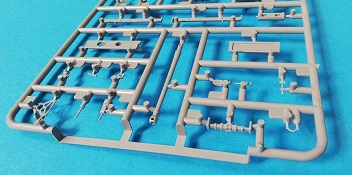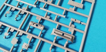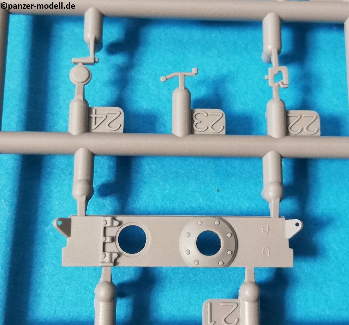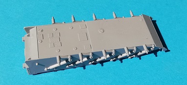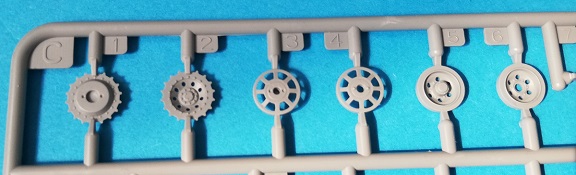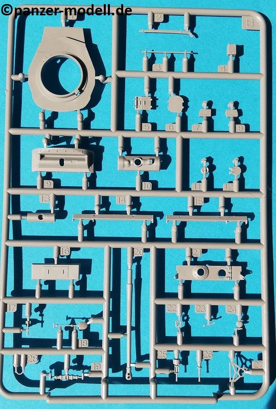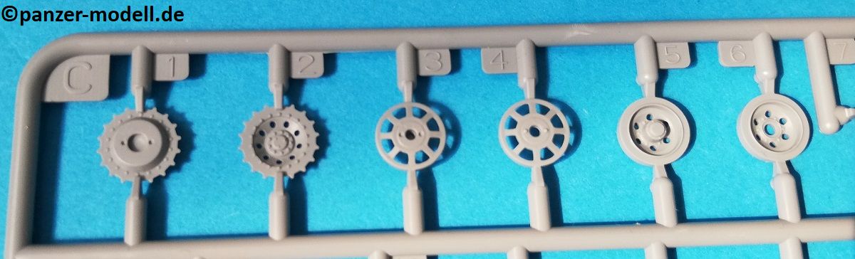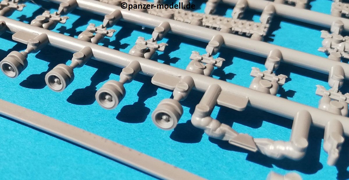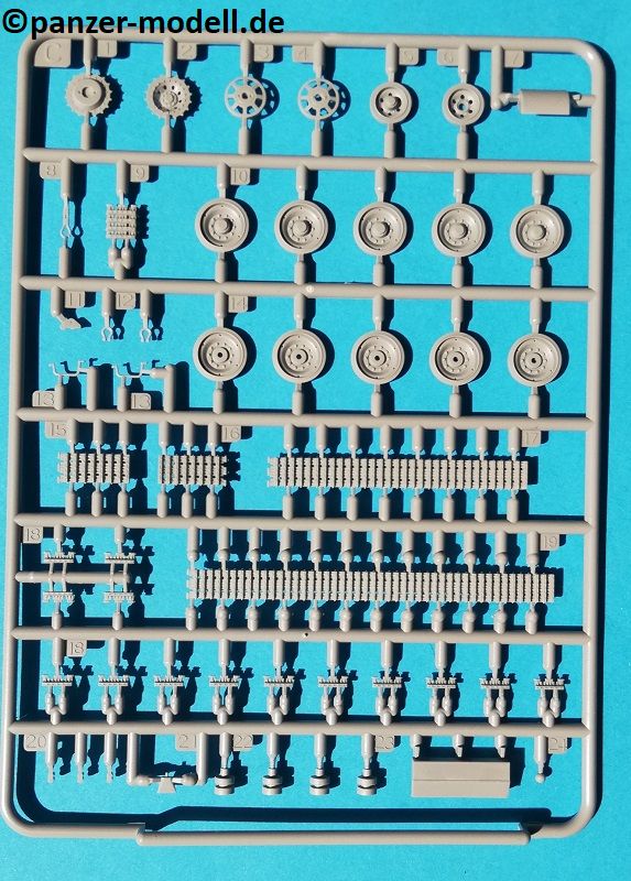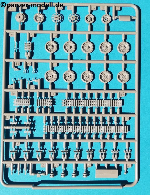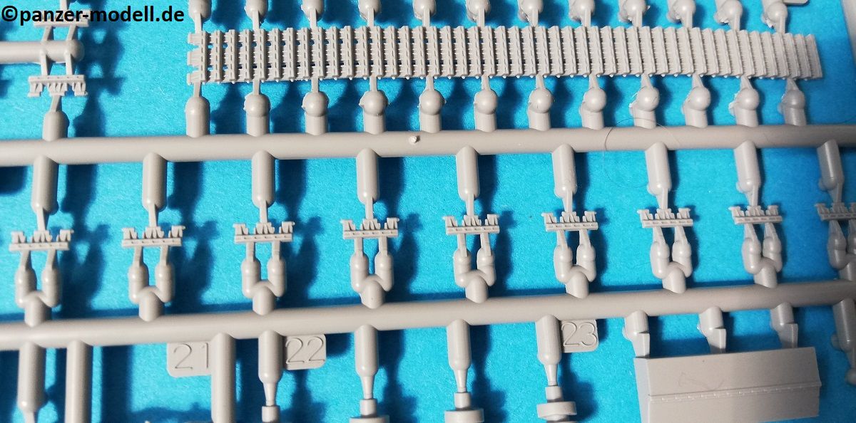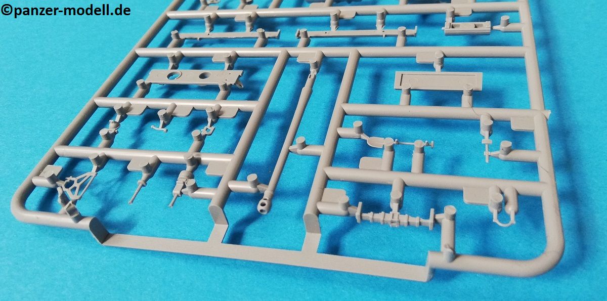 Der Spritzguss bewegt sich durchgehend auf einem hohen Niveau. Am Bausatz sind augenscheinlich keine Fischhäute vorhanden und auch die Auswerfermarken sind geschickt an solche Stellen gesetzt, welche man später nicht mehr sieht. Die einzelnen Bauteile machen einen hervorragenden Eindruck. Allein die Unterwanne aus einem Guss, weist schon viele schöne Details und sehr gut gemachte Schweißnähte auf. Die Schwingarme sind hier angegossen, was zwar dem Dioramenbauer nicht sehr entgegen kommt, da jedoch eine Segmentkette beiliegt, ist ein Anpassen an den Grund sowieso nicht gegeben. Die Detailfülle hier ist beeindruckend, da auch die Dämpfer in einer sehr hohen Qualität mit angegossen sind. Fast zu Schade diese hinter der äußeren Rumpfpanzerung zu verstecken. Die äußere Rumpfpanzerung ist mit jeder Menge Details, Schraubenköpfen sowie den Seitenvorgelen sehr schön ausgeführt. Alle Laurollen und die Triebräder bestehen aus zwei Teilen und sind fein graviert und detailliert Eine Augenweide. Die Stützrollen und die Staukästen sind im Slide-Mould verfahren gegossen und sind bereits in einem Stück. Das ist bei den filigranen Teilen eine echte Hilfe.