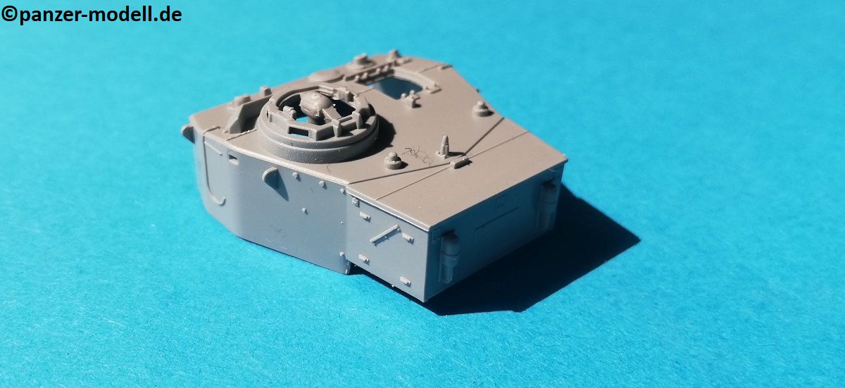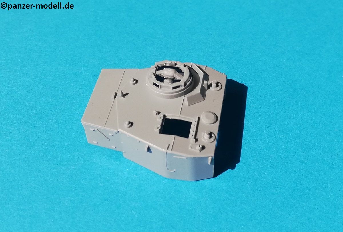 Die Oberwanne besteht aus einem Stück, bei dem noch einige Bauteile angebaut werden. Auch hier zeigt sich eine Fülle von feinen Details. Allerdings sind alle Handgriffe angegossen, was aber in diesem Maßstab durchaus zu verschmerzen ist. Das Lüftergitter am Heck ist ebenfalls graviert, und kann nicht ohne weiters durch ein Fotoätzteil ersetzt werden, da sich genau unterhalb dieser Stelle einer der beiden Passstifte befindet, welcher zur Verbindung der Ober- und Unterwanne dient. Das Gitter ist jedoch derart fein graviert, dass dies kein Nachteil ist. Zudem wird bei allen Versionen ein „Normandy cowling“ Deflektor über den Auspuff gesetzt. Hiervon sind zwei verschiedene im Bausatz enthalten.
