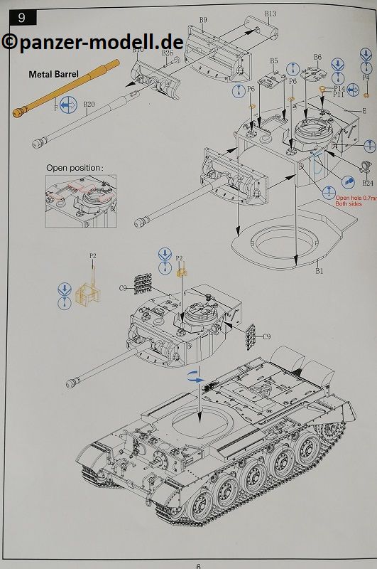 Nun kommen wir zum Aber: Alle Luken am Turm und an der Wanne können leider ohne größere Umbauten nur geschlossen dargestellt werden. Außerdem ist am Turmheck eine Platte modelliert, die so nur bei irischen Nachkriegs Comets vorhanden war, da sich dort das Kennzeichen befand, dies muss bei den darstellbaren Fahrzeugen unbedingt entfernt werden. Ebenso müssen laut Bauplan auch einige andere angegossene Details entfernt werden. Diese gehören zu der wahrscheinlich noch kommenden Ausführung MK1B (Um mal im Kaffeesatz zu Lesen ý˝ ), hierauf deuten auch die auf der Bauanleitung als „nicht zu verwenden“ gekennzeichneten Teile hin, die sich an den Spritzlingen befinden. Zum Schluss fehlt noch die Regendichte Persenning über der Hauptbewaffnung. Dies ist umso ärgerlicher, da es keine Fotos von Weltkriegsfahrzeugen ohne diese Abdeckung gibt (Ich persönlich kenne jedenfalls keines). Sollte es diese Abdeckung (wie beim Bronco Pendant in 1:35) jemals im Aftremarket in Resin geben, so ist hervorzuheben, dass man hier gleich die ganze Front mitsamt Blende direkt stumpf an den Turm kleben kann, da dies auch in Plastik ein separates Teil ist. Ansonsten kann der versierte Modellbauer die Abdeckung natürlich auch Scratchen, dies sollte keine unüberwindliche Hürde darstellen.