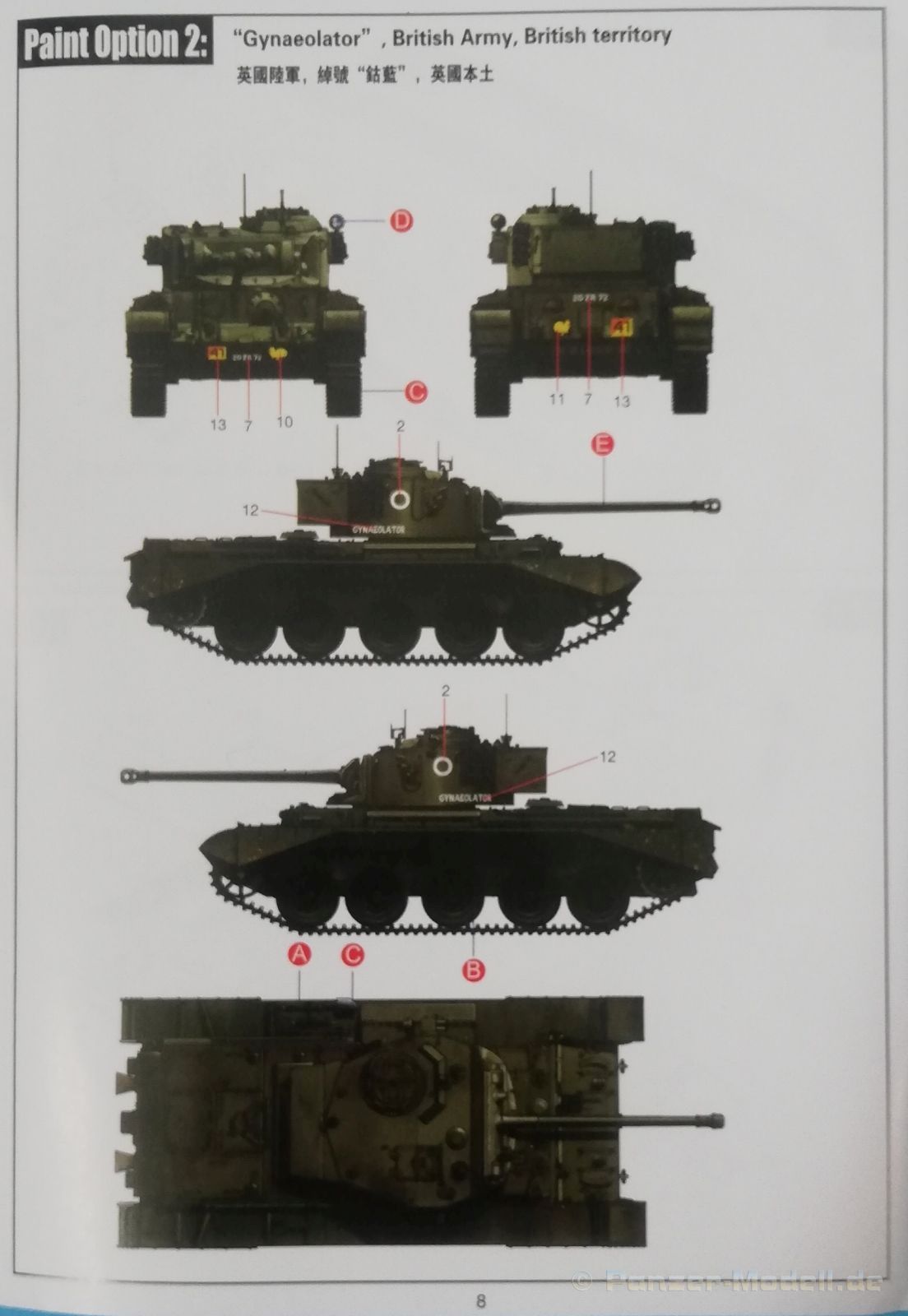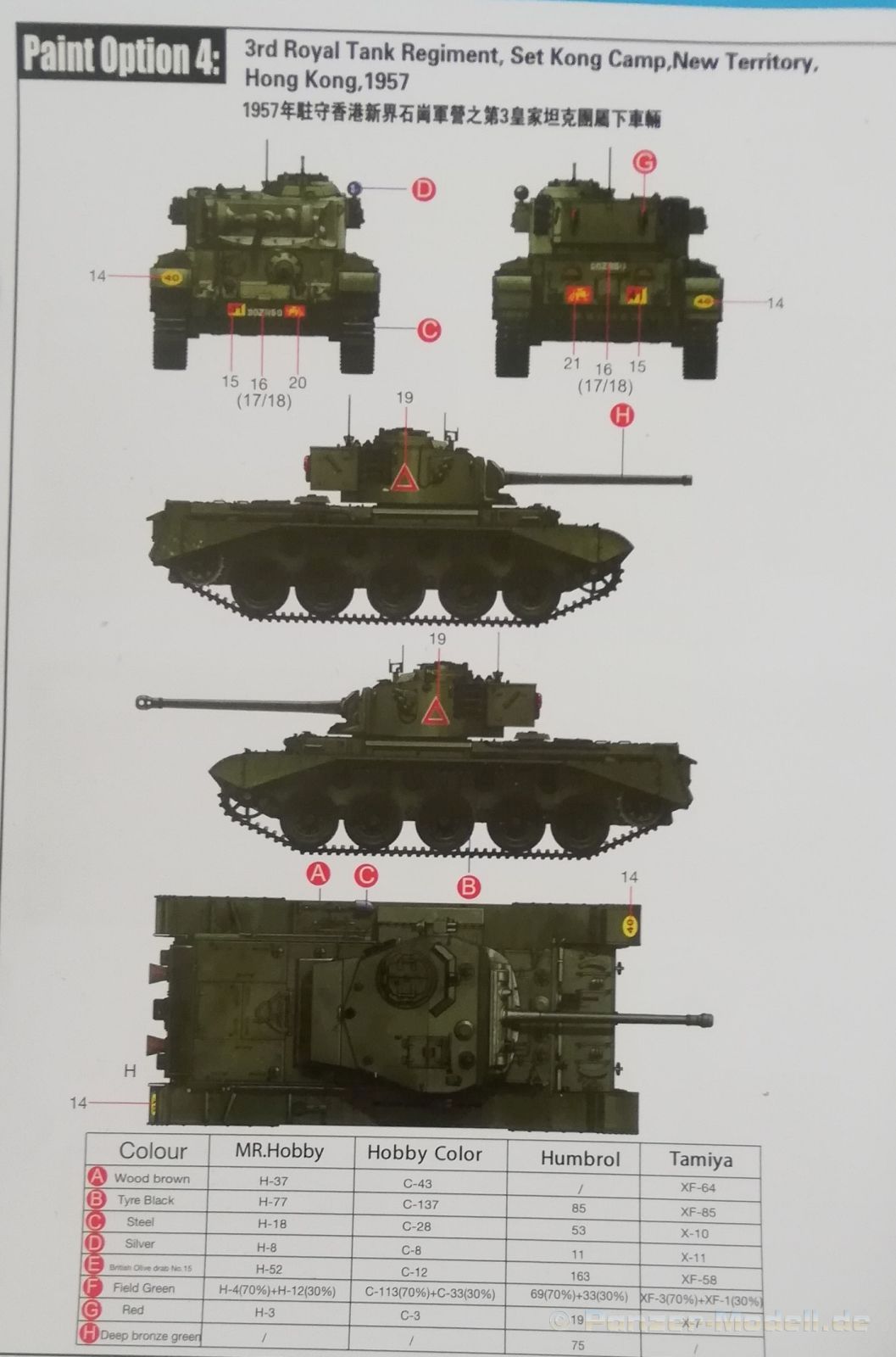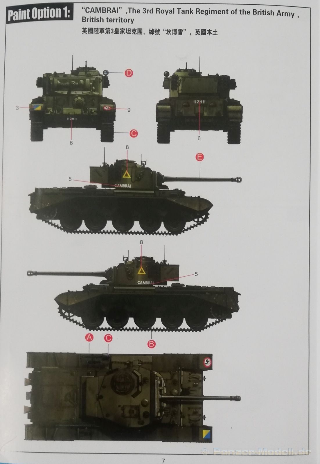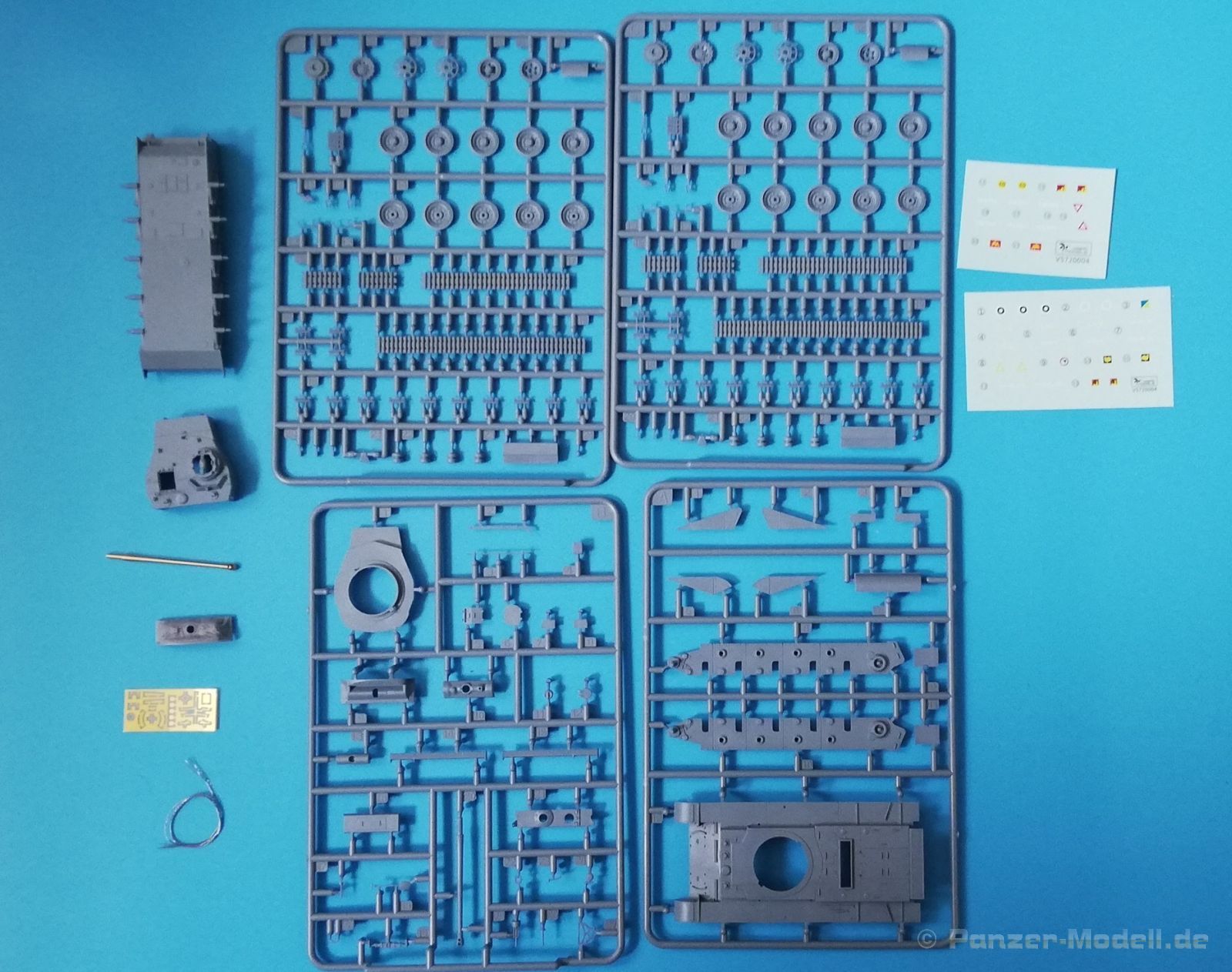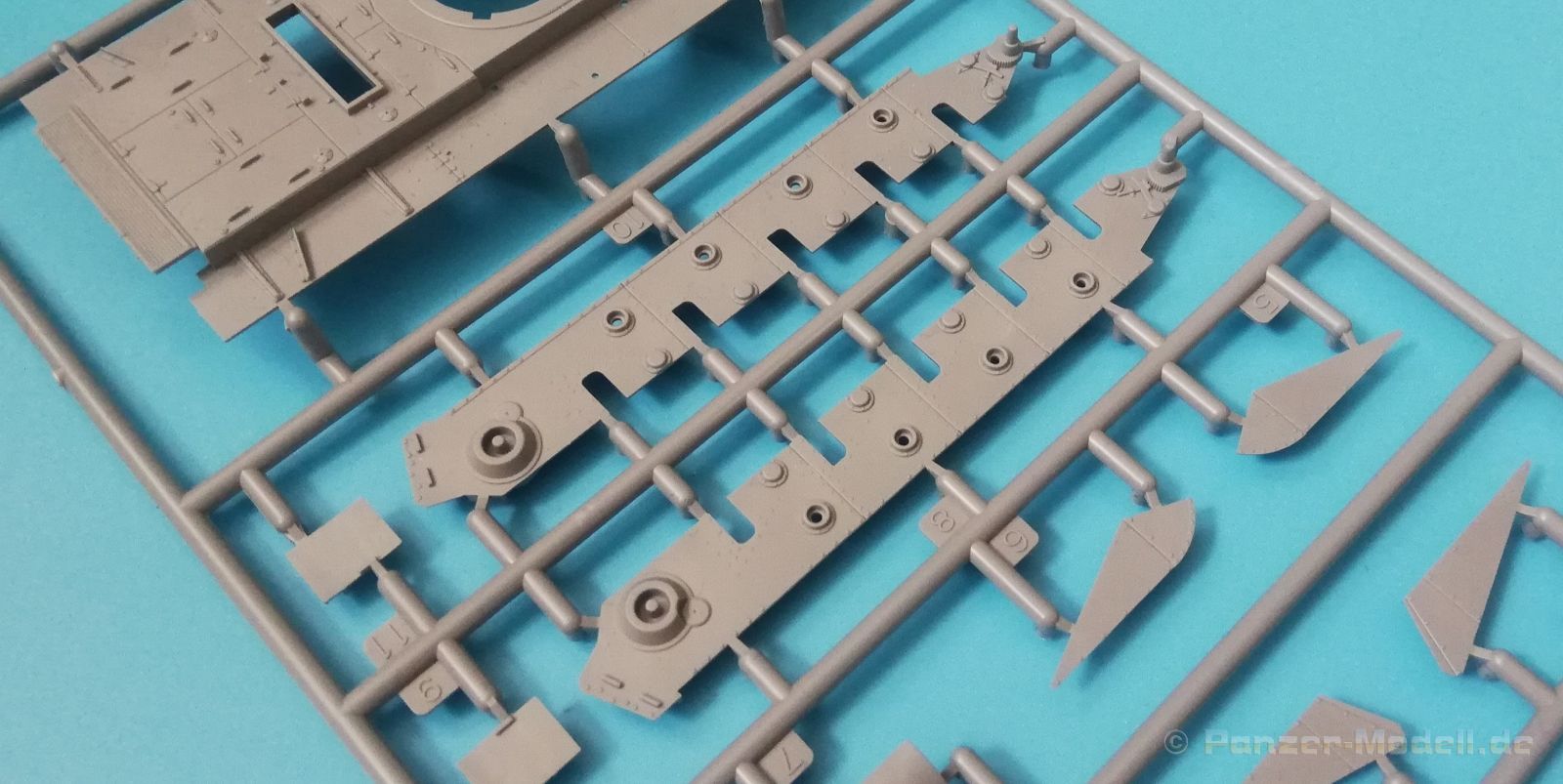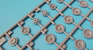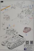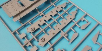 Der Spritzguss bewegt sich durchgehend auf einem hohen Niveau. Am Bausatz sind augenscheinlich keine Fischhäute vorhanden und auch die Auswerfermarken sind geschickt an solche Stellen gesetzt, welche man später nicht mehr sieht. Die einzelnen Bauteile machen einen hervorragenden Eindruck. Allein die Unterwanne aus einem Guss, weist schon viele schöne Details und sehr gut gemachte Schweißnähte auf. Die Schwingarme sind hier angegossen, was zwar dem Dioramenbauer nicht sehr entgegen kommt, da jedoch eine Segmentkette beiliegt, ist ein Anpassen an den Grund sowieso nicht gegeben. Die Detailfülle hier ist beeindruckend, da auch die Dämpfer in einer sehr hohen Qualität mit angegossen sind. Fast zu Schade diese hinter der äußeren Rumpfpanzerung zu verstecken. Die äußere Rumpfpanzerung ist mit jeder Menge Details, Schraubenköpfen sowie den Seitenvorgelen sehr schön ausgeführt. Alle Laurollen und die Triebräder bestehen aus zwei Teilen und sind fein graviert und detailliert Eine Augenweide. Die Stützrollen und die Staukästen sind im Slide-Mould verfahren gegossen und sind bereits in einem Stück. Das ist bei den filigranen Teilen eine echte Hilfe. Nun kommen wir zum Aber: Alle Luken am Turm und an der Wanne können leider ohne größere Umbauten nur geschlossen dargestellt werden. Außerdem ist am Turmheck eine Platte modelliert, die so nur bei irischen Comets vorhanden war, da sich dort das Kennzeichen befand, dies muss bei den darstellbaren Fahrzeugen unbedingt entfernt werden. Ebenso die beiden dort angegossenen Feuerlöscher. Die klar gegliederte Bauanleitung führt in Neun Schritten zum Ziel und ist nicht überladen. Es werden vier Bemalungsoptionen angegeben: