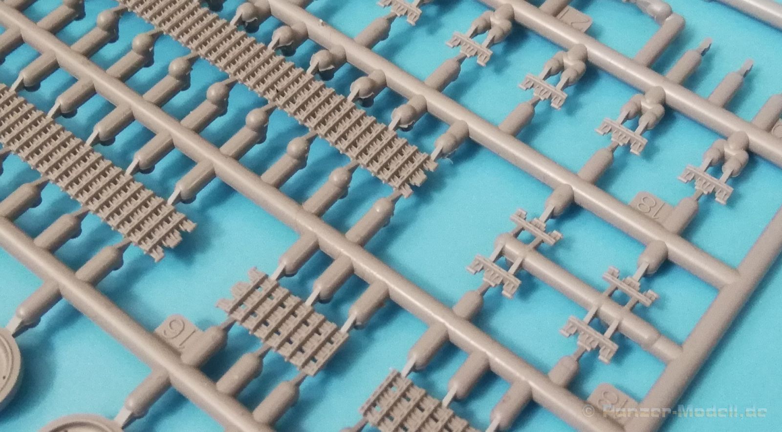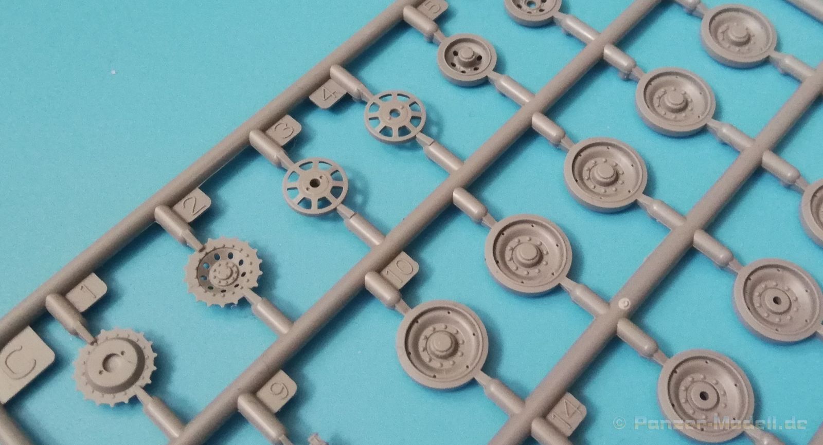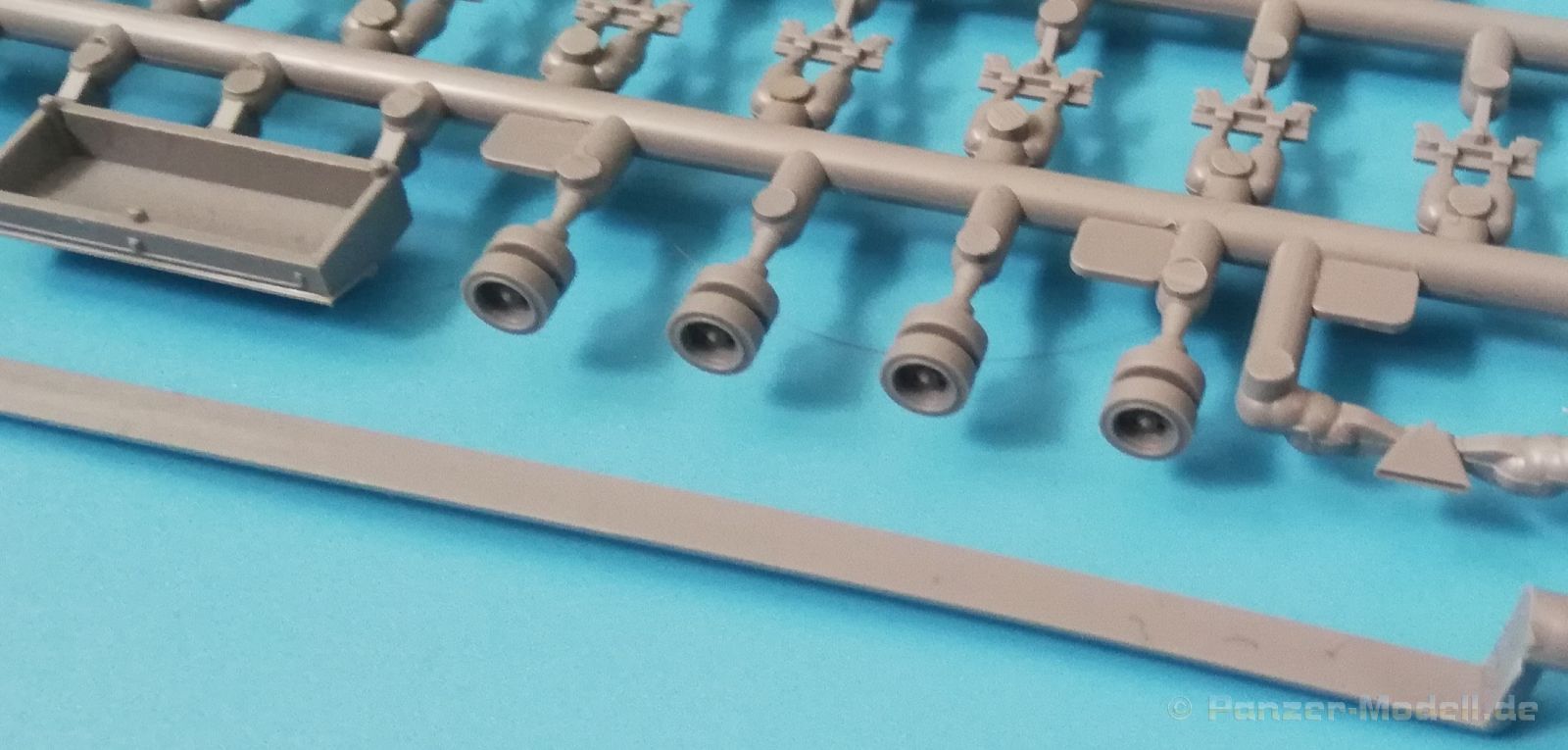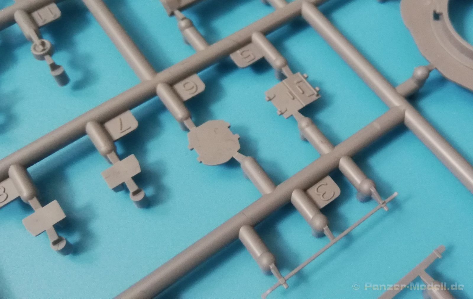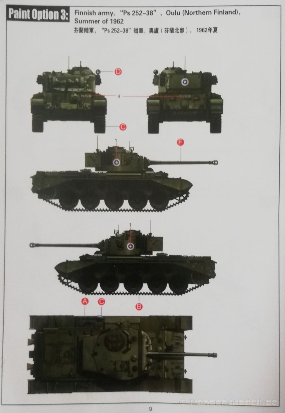 Der Spritzguss bewegt sich durchgehend auf einem hohen Niveau. Am Bausatz sind augenscheinlich keine Fischhäute vorhanden und auch die Auswerfermarken sind geschickt an solche Stellen gesetzt, welche man später nicht mehr sieht. Die einzelnen Bauteile machen einen hervorragenden Eindruck. Allein die Unterwanne aus einem Guss, weist schon viele schöne Details und sehr gut gemachte Schweißnähte auf. Die Schwingarme sind hier angegossen, was zwar dem Dioramenbauer nicht sehr entgegen kommt, da jedoch eine Segmentkette beiliegt, ist ein Anpassen an den Grund sowieso nicht gegeben. Die Detailfülle hier ist beeindruckend, da auch die Dämpfer in einer sehr hohen Qualität mit angegossen sind. Fast zu Schade diese hinter der äußeren Rumpfpanzerung zu verstecken. Die äußere Rumpfpanzerung ist mit jeder Menge Details, Schraubenköpfen sowie den Seitenvorgelen sehr schön ausgeführt. Alle Laurollen und die Triebräder bestehen aus zwei Teilen und sind fein graviert und detailliert Eine Augenweide. Die Stützrollen und die Staukästen sind im Slide-Mould verfahren gegossen und sind bereits in einem Stück. Das ist bei den filigranen Teilen eine echte Hilfe. Nun kommen wir zum Aber: Alle Luken am Turm und an der Wanne können leider ohne größere Umbauten nur geschlossen dargestellt werden. Außerdem ist am Turmheck eine Platte modelliert, die so nur bei irischen Comets vorhanden war, da sich dort das Kennzeichen befand, dies muss bei den darstellbaren Fahrzeugen unbedingt entfernt werden. Ebenso die beiden dort angegossenen Feuerlöscher. Die klar gegliederte Bauanleitung führt in Neun Schritten zum Ziel und ist nicht überladen. Es werden vier Bemalungsoptionen angegeben: