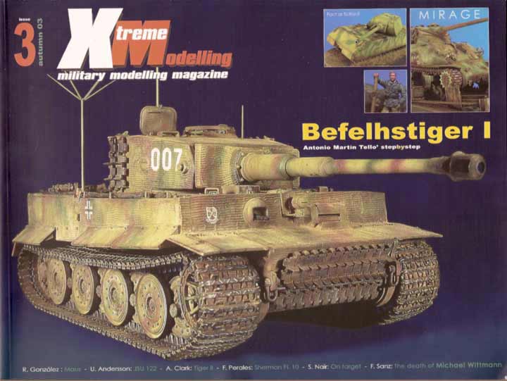 Das Hauptthema dieses Heftes ist der Bau und die Bemalung eines 1/35 Befehlstigers von Antonio Martin Tello. Dieser Beicht ist als step by step Bericht gemacht, der dem geneigten Modellbauer viel Informationen und exzellente Fotos zum nachmachen anbietet. Besonderes Augenmerk ist auf die Bemalung und Alterung gelegt - hier ist alles genau dargestellt, von Decals, übers Mapping, Filtern, Washing, Pigmente, usw. Ein bisschen komisch ist der durchweg benutzte Schreibfehler eines "Befelhstiger". ;-)