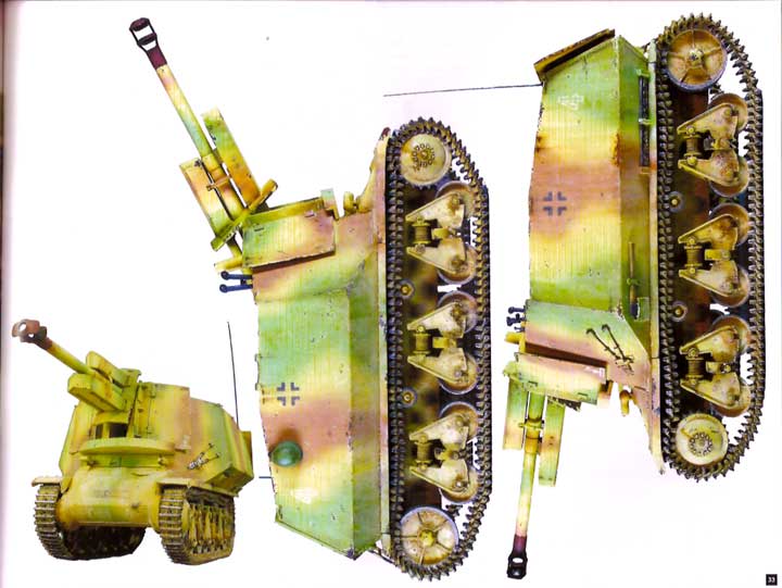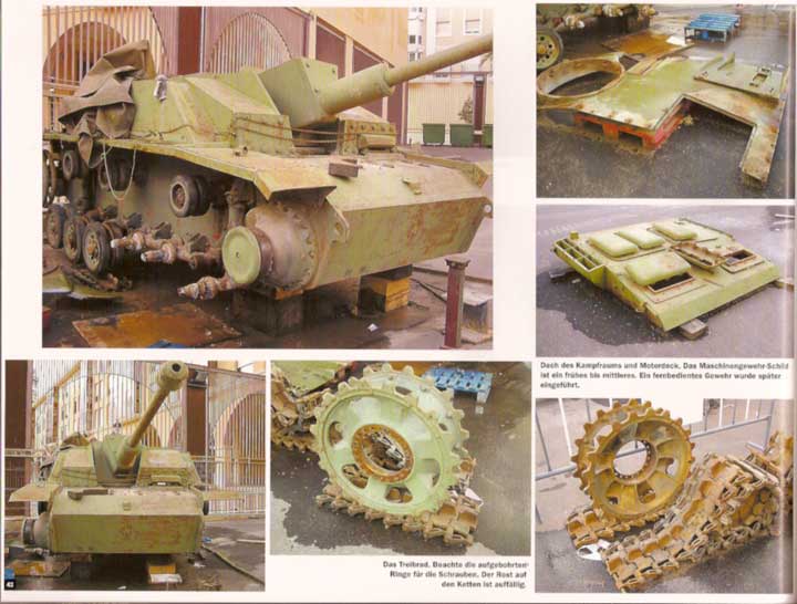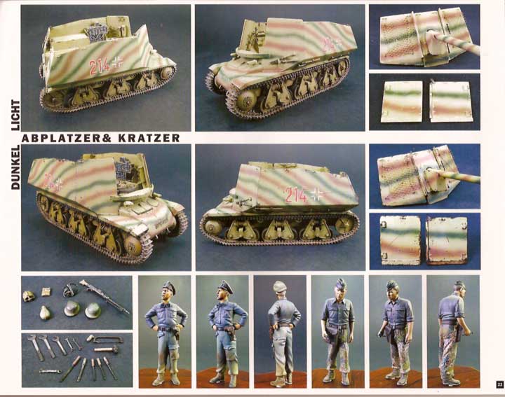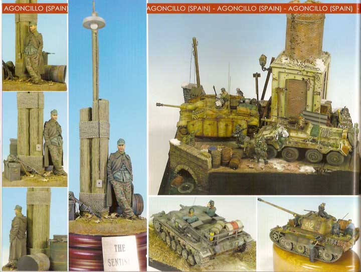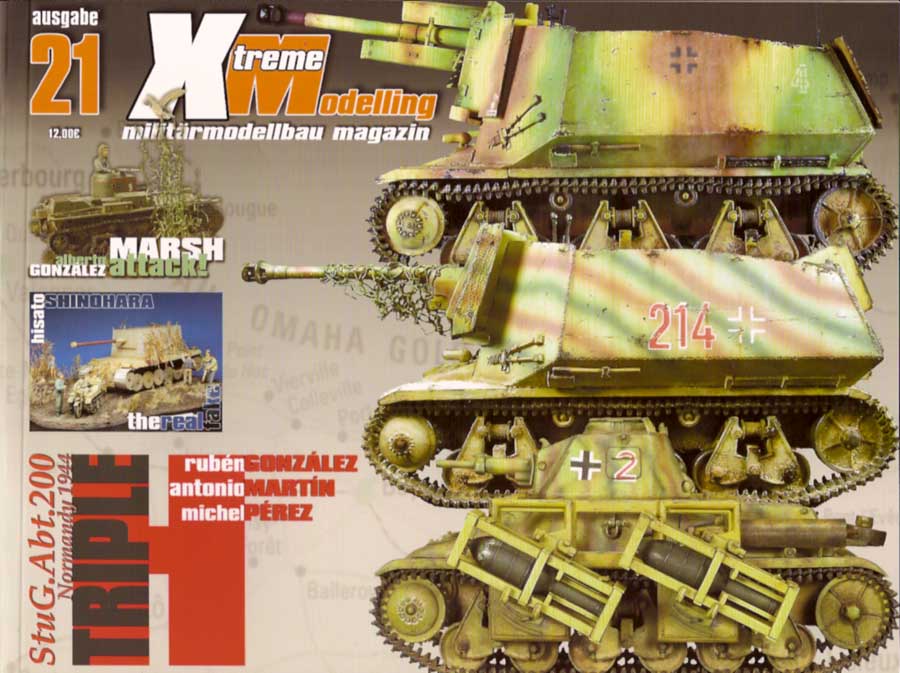 Es folgen 8 Seiten über den 28/32cm Wurfrahmen auf Pz.Kpfw.39H von Antonio Martín Tello. Hier werden Bau und Bemalung mit vielen Einzelschritt Bildern und Text erläutert Darauf folgen 9 Seiten über die 7,5cm PaK40 auf Gw.39H von Rubén González. Auch hier wird genauer auf den Bau, Nachdeteilierung und die Bemalung mit alterung eingegangen - gerad die bemalung des Innenraums ist extrem gut gelungen. Es folgt der 6 Seiten lange Artikel über die 10,5cm leFH18 auf Gw.39H von Michel Pérez. Hier liegt das hauptaugenmerk auf der Bemalung und Alterung, was mit vielen schönen Bildern verdeutlicht wird. Auf 3 Seiten gibt es dann einen netten kleinen Artikel über das Diorama "Marsh Attack" von Alberto G. de la Peña. Dieses ist mehr eine Vignette, bietet aber einiges fürs Auge und ist unheimlich gut gemacht. Weitere 8 Seiten zeigen mal wieder ein original - in diesem Fall die Restauration eines StuG III Ausf.G im Museum Cartagena in Spanien. Dabei zeigen die vielen Fotos viel von Innenleben und Details einzelner Komponenten des StuG's während der Restauration. Hier gibt es Einblicke und Aufnahmen, wie man sie sonst selebr nie machen könnte. Auf 5 Seiten geht es dann um das 1/48 Modell des Panzer IV/70(A) von Sven Frisch, der auf den Bau, Eigenumbauten und sehr genau auf Bemalung und Alterung eingeht.. Weitere 5 Seiten zeigen sehr schöne Impressionen einige sehr guter Modelle und Dioramen der Ausstellung in Agoncillo(Spanien) 2006. Die restlichen Seiten werden von Werbung und einigen Produkt- und Buchreviews gefüllt.