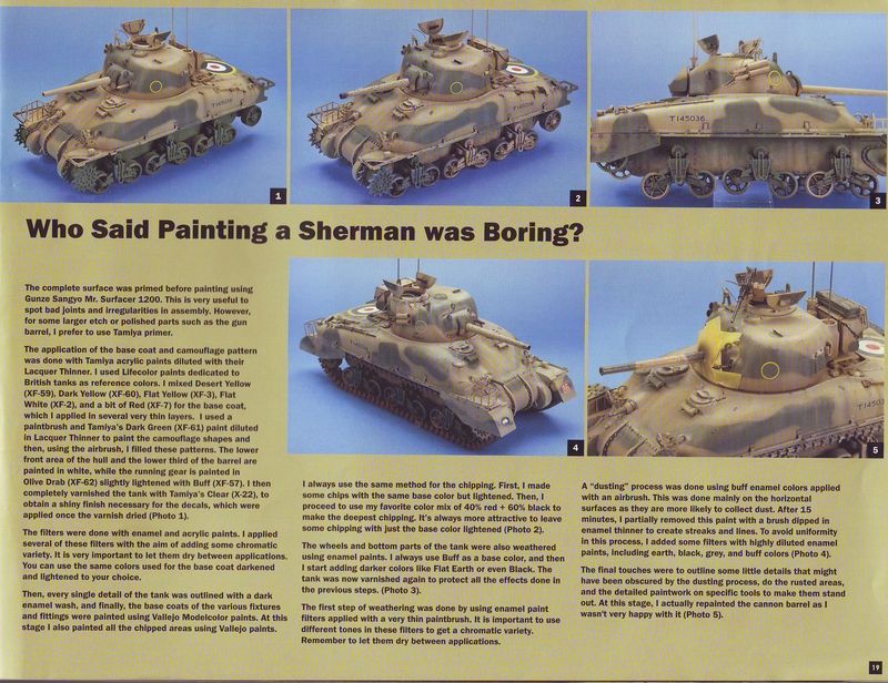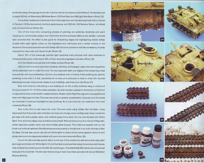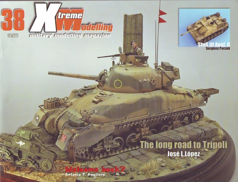 Nach einem kurzem Vorwort startet diese Ausgabe mit einem Artikel von Sergiusz Peczek. Auf nicht weniger als 8 Seiten stellt er den Bau eines StuG III Ausf. G vor. Hier gibt es jede Menge tolle Detailphotos und schöne Schritt für Schritt Anleitungen bei Lackierung und Alterung. Beim nächsten Artikel steht ein recht außergewöhnliches Fahrzeug im Mittelpunkt. Pedro Andrada hat einen ZIS LKW gebaut, welcher für den Einsatz auf Schienen gedacht war. Dieses Fahrzeug im Maßstab 1/72 bekam umfangreiche Scratcharbeiten verpasst. Der nächste Artikel kommt von José L. López. Unter dem Titel 'The long way to Tripoli' beschreibt er den Bau eines Sherman II. Hier gibt es einen schönen Bericht, über die Lackierung des Shermans. Weiter geht es mit einem achseitigem Bericht von Antonio T. Aguilera. In seinem Artikel 'Welcome back' beschreibt er den Bau eines Carro Armato M13/40. Auch hier gibt es wieder schöne Bilder vom gebauten Modell und eine aufschlussreiche Schritt für Schritt Anleitung für die Bemalung/Alterung des Fahrzeuges. Im folgenden Artikel kommen nun auch die Fans moderner Fahrzeuge nicht zu kurz auf 6 Seiten beschreibt Sven Heimroth den Bau eines M51 ARV aus dem Vietnamkrieg. Auch hier gibt es einige tolle Photos vom fertigen Fahrzeug. Es folgt ein kurzer Artikel von Jorge Jaldón. Seine Szene 'Zur Brücke' zeigt einen verlassenen T-26 der russichen Armee, welcher als Schilderbaum umfunktioniert wurde. Den Abschluss dieser Ausgabe bildet ein Bericht von der Euromilitaire 2009 mit vielen tollen Modellen, sowie eine kurze Neuheitenvorschau. Mit einem Preis 10 EUR bietet die Ausgabe 38 der Xtreme Modelling einen interessanten Streifzug durch das Thema Militärmodellbau mit einem Mix aus nicht alltäglichen Fahrzeugen. Xtreme Modelling Hefte sind u.a. erhältlich bei:
