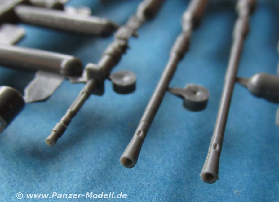 Der Turm ist ebenso mehrteilig aufgebaut und macht einen guten Eindruck. Die Kommandantenkuppel ist mit klaren Plastikeinsätzen für die Optiken ausgestattet, und natürlich offen oder geschlossen baubar. Für die Waffenblende liegt zum einen das koaxiale MG34 als auch die lange und die kurze Version der 2cm Kanone enthalten. Alles aus Spritzguss und beachtlich fein gestaltet mit offener Mündung. Natürlich kein vergleich geegn entsprechende Rohre aus Metall, aber dennoch wirklich schön.