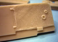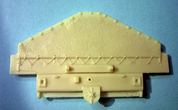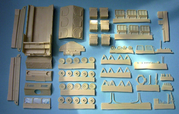 Die 112 Resinteile des Komplettmodells sind blasen- und verzugsfrei gegossen. Bei der Detaillierung liegen Licht und Schatten dicht beieinander. Besonders schön gelungen ist so z.B. die filigranen Leiträder, die Sicke mit Verzurrhäkchen an den Längsseiten und das Heck mit seiner sehr realistischen Planenstruktur. Als schlicht und ergreifend grottig muss man hingegen das Motordeck bezeichnen (siehe Foto). Die Abdeckgitter sind zwar angedeutet, aber dermassen schlecht und sollten auf jeden Fall abgeschliffen und durch fotogeätzte Gitter ersetzt werden.
