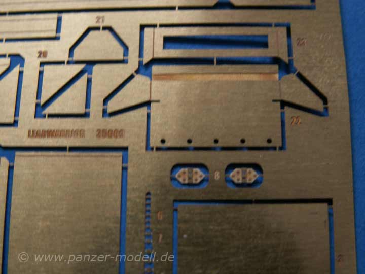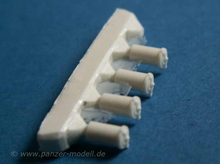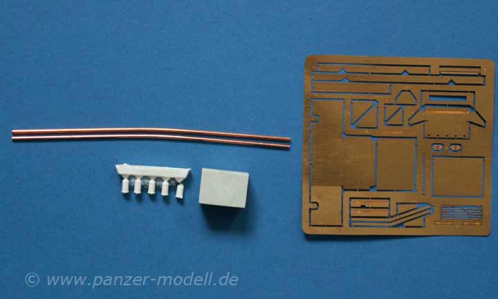 Der Umbausatz basiert hauptsächlich auf Fotoätzteilen, zwei Metallstangen und Resinteilen. Die Resinteile umfassen das Sprengpaket und die obligatorischen Nebelbecher - diese sind in sehr guter Qualität gegossen.