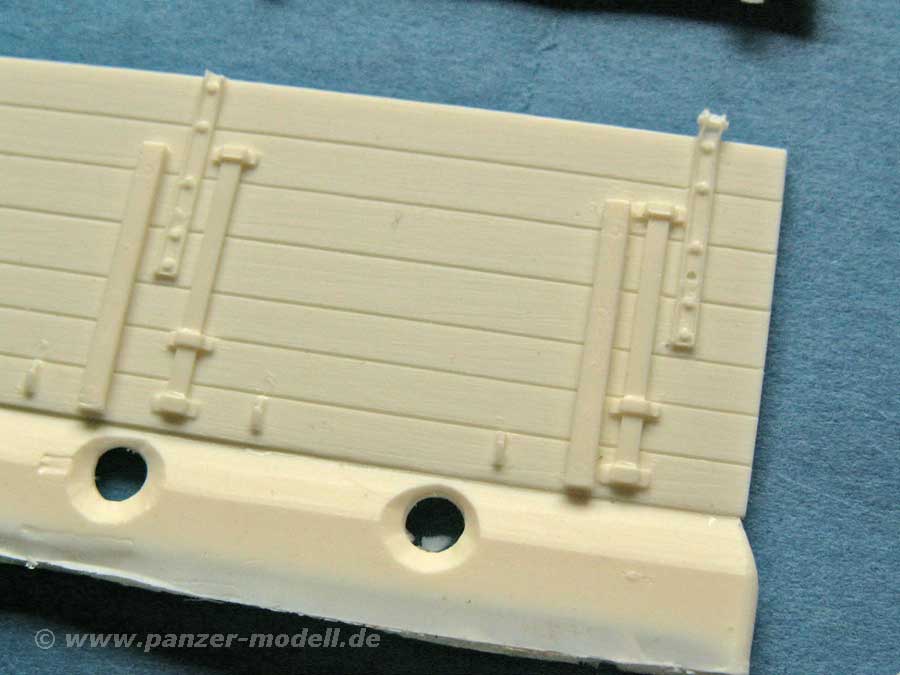 Der Umbausatz enthält 54 Resinteile. Diese sind schön detailiert und sehr fein gegossen, gerade die Holzplanken mit ihrer feinen Maserung und die Schienenräder wissen sehr zu gefallen. Der Umbausatz benötigt den Tamiya Steyr 1500 als Basismodell.