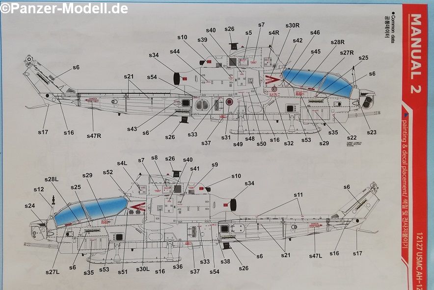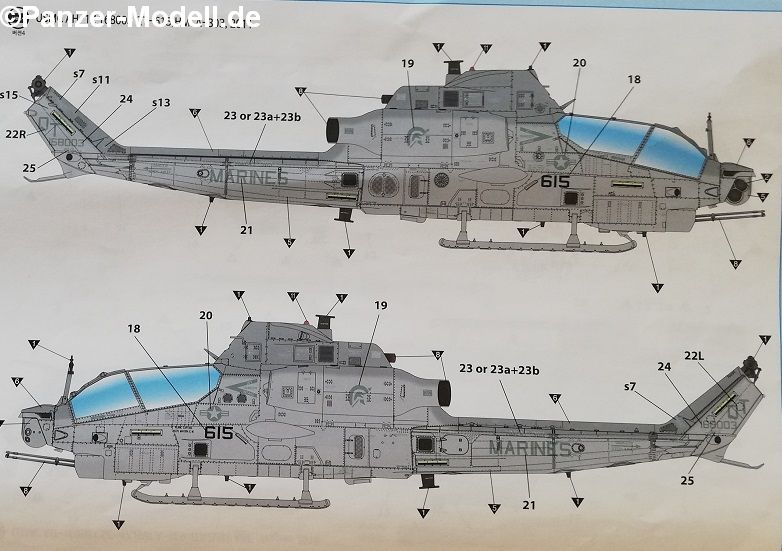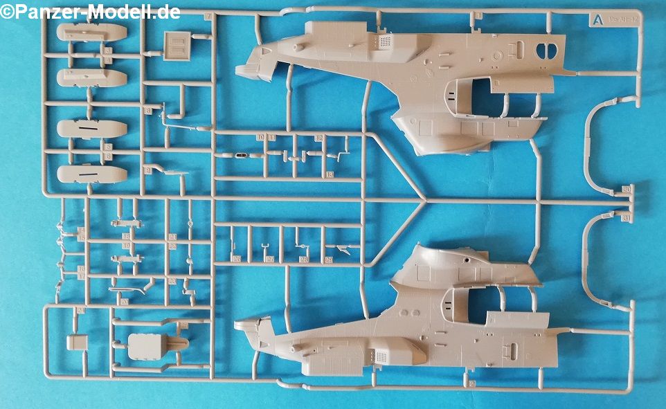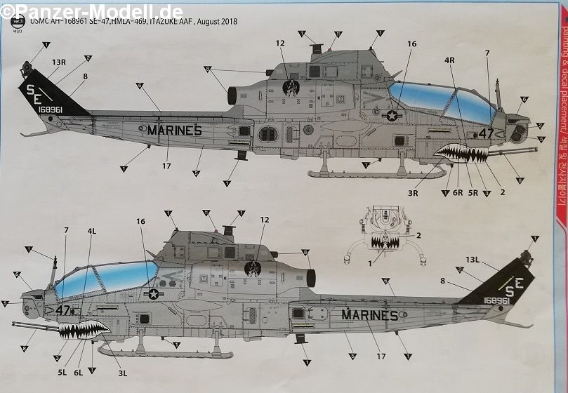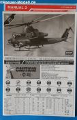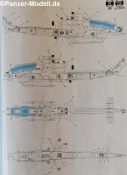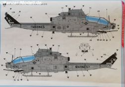 Die US Army erkannte in den 60er Jahren die Notwendigkeit, spezielle Kampfhubschrauber für den Einsatz in Vietnam zu entwickeln. Nach dem 1:35 Modell der AH-1W von MRC/ Academy Modell von 1992 und seinen Wiederauflagen von Italeri/ AFV-Club / Academy kommt jetzt ein zeitgemäßer Bausatz des Nachfolgemodells aus 100% neuen Formen. An fünf sauber gespritzten grauen Gussästen und einem klaren Gussast finden sich feine und schön gravierte Bauteile. Auch die Klarsichtteile machen einen ganz hervorragenden Eindruck. Sie sind klar und haben genau die richtige Stärke. Mit den beiliegenden Masken können die Kanzel und die Zieloptiken zum Lackieren abgedeckt werden sehr Vorbildlich. Es liegt eine Ätzteilplatine zur Verfeinerung bei, diese beinhaltet hauptsächlich Gitter und Abdeckungen für die verschiedenen Triebwerksöffnungen/ Abluft-Grätings. Interessanterweise können die meisten Fotoätzteile nach dem eigentlichen Bau am Modell angebracht werden, was in einem separaten Schritt erläutert wird. Als Bewaffnungsoptionen sind Hellfire Raketen, Rocket Pods und Sidewinder Raketen enthalten. Dazu natürlich die schön gestaltete Revolverkanone im Kinnturm (Wobei es hier zu den Plastikläufen bereits schöne alternative Metallrohre von verschiedenen Herstellern gibt). Die zweiteilige Bauanleitung führt im ersten Teil in 17 klaren und sehr übersichtlichen Schritten zum fertigen Modell. Im zweiten Teil wird die Bemalung der Maschinen, die Positionierung der Decals und die Anbringung vieler Ätzteile gezeigt. Die Farbangaben beziehen sich auf Humbrol, Gunze, Lifecolor, Testors/ Modelmaster, Revell, Vallejo und AK Interactive. Wobei natürlich auch die Farben anderer Hersteller genutzt werden können. Mit den beiliegenden hervorragend recherchierten und perfekt gedruckten Decals, welche von Cartograph gedruckt wurden, lassen sich vier Maschinen darstellen: