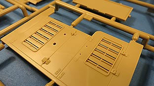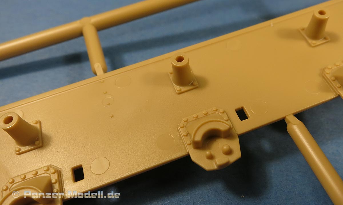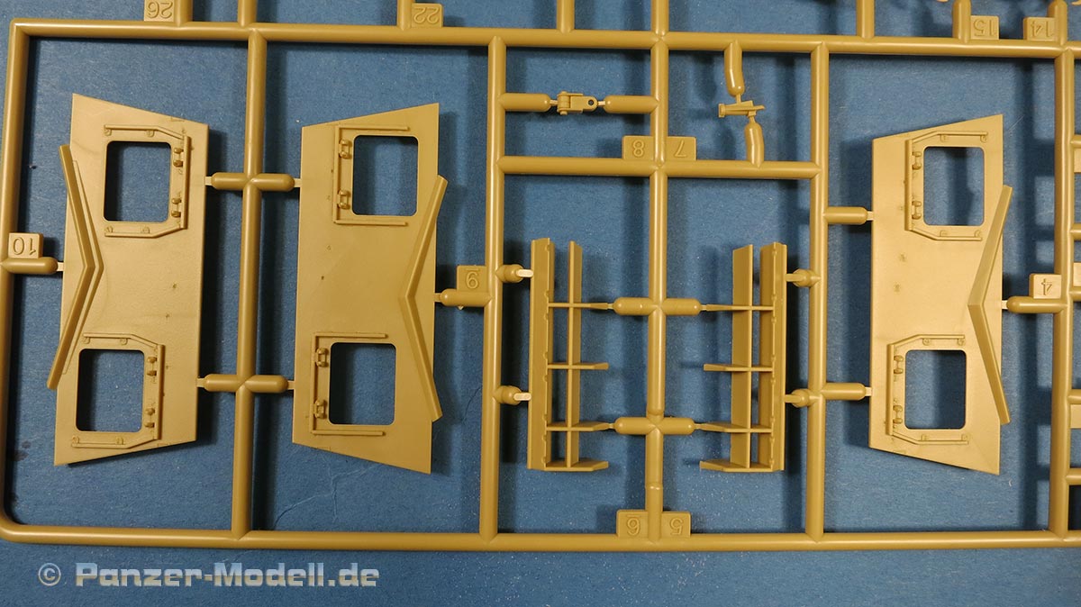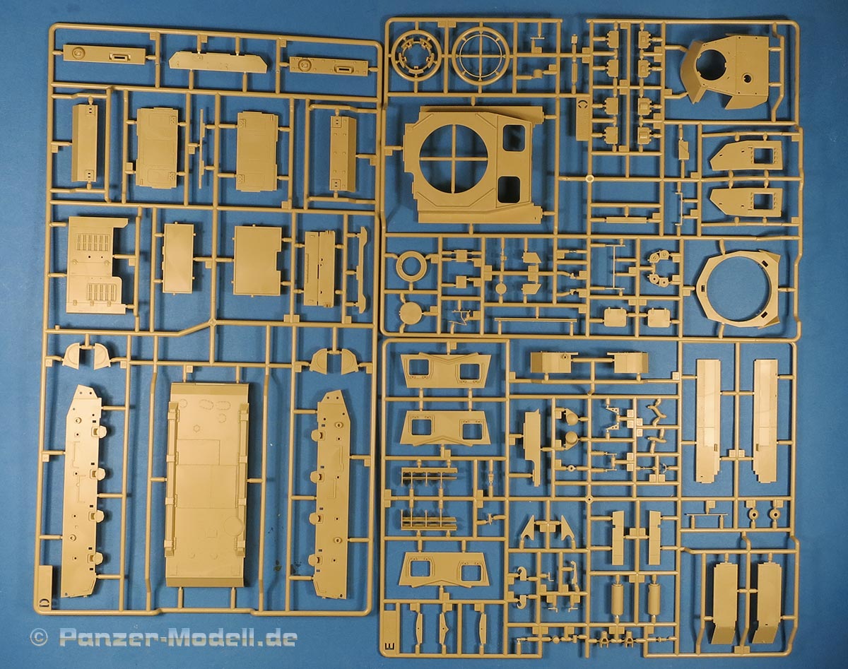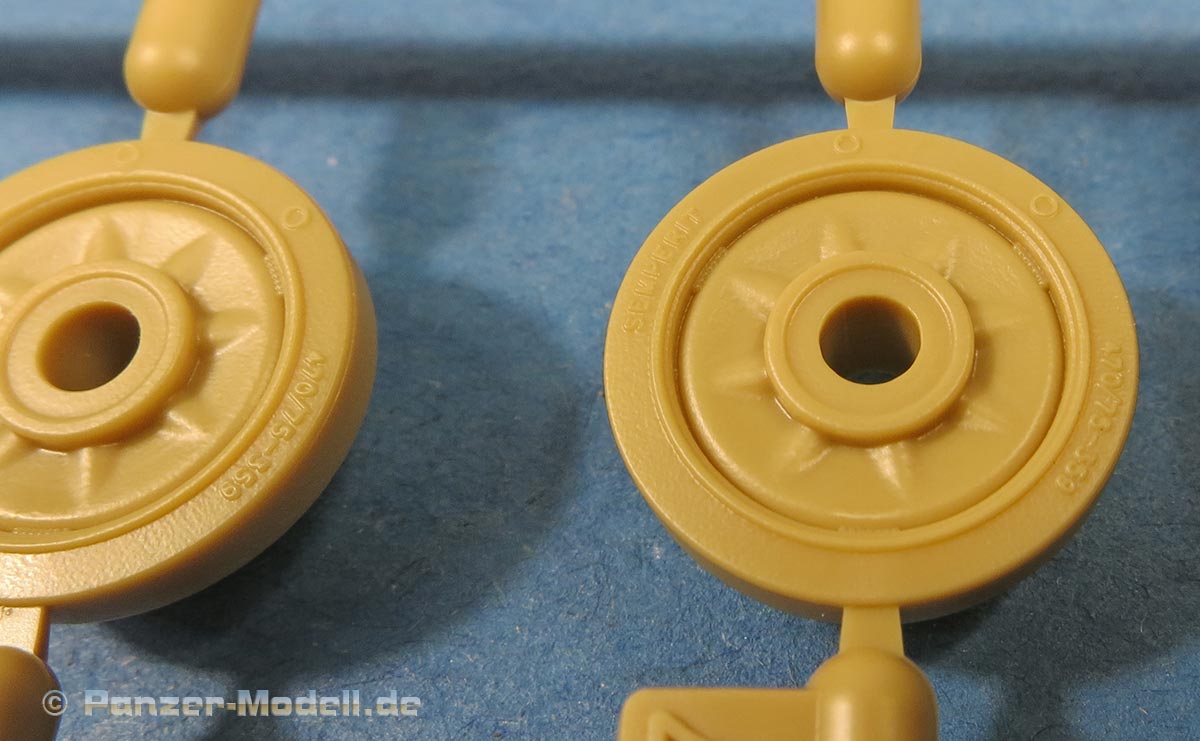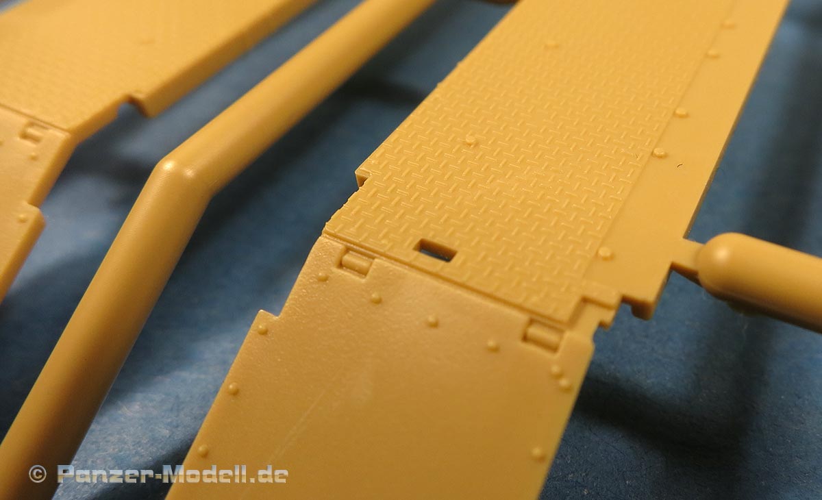 Alle Bauteile machen einen durchweg guten Eindruck, sind frei von Fischhäuten und später sichtbaren Auswerfermarken. Die Detaillierung ist ansprechend und deutlich besser als beim alten Panzer IV von Academy und teilweis erstaunlich fein, wie z.B. die Herstelleraufdrucke auf den Gummibandagen der Laufrollen (Übrigens kein Continental, sondern Semperit). Auch die Schweißnähte, Senkkopfschrauben oder die Riffelblechstruktur der Kettenbleche sind schon richtig gut gemacht.