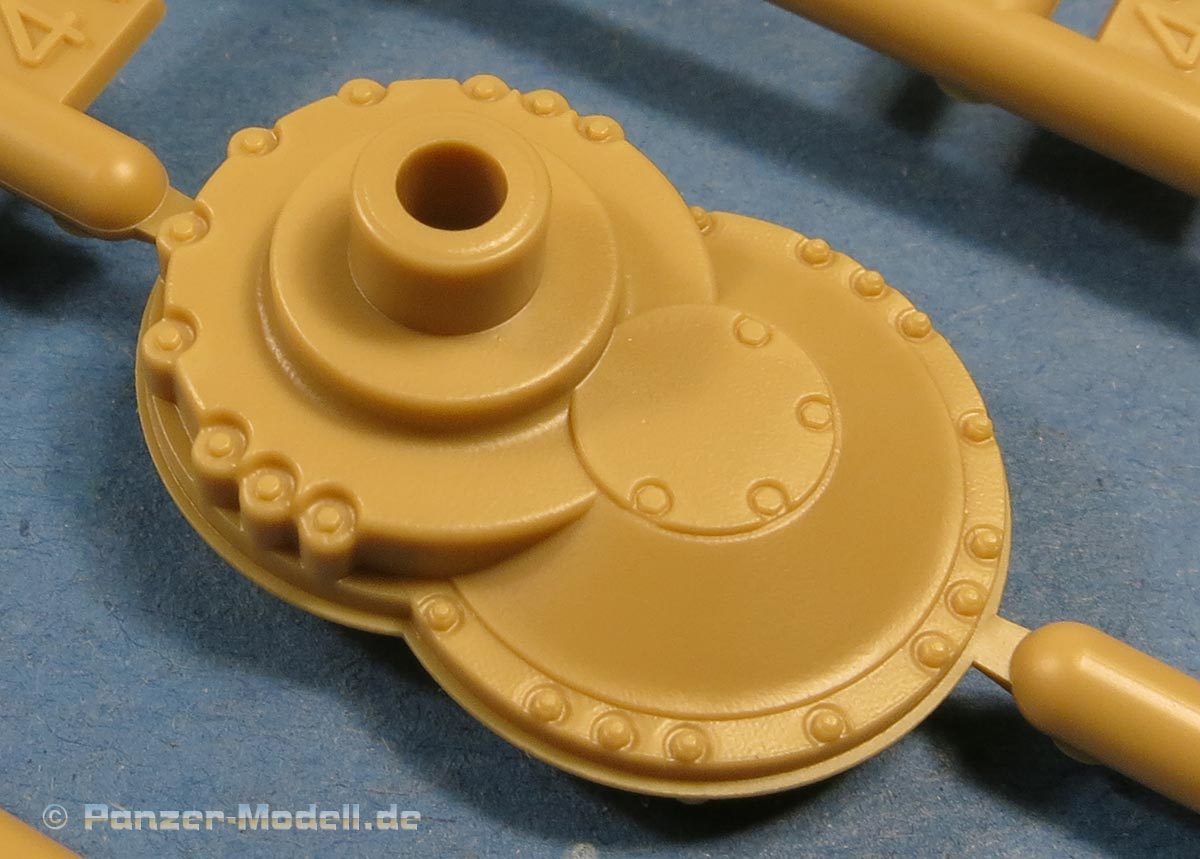 Der Turm setzt sich aus aus wenigen Großteilen zusammen, wobei das Oberteil noch mit zusätzlichen Seitenteilen versehen werden muss. Die Deckplatte macht einen guten Eindruck mit vielen kleinen Details. Die Kommandantenkuppel ist mehrteilig mit ziemlich guten und feinen Details.