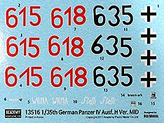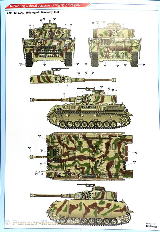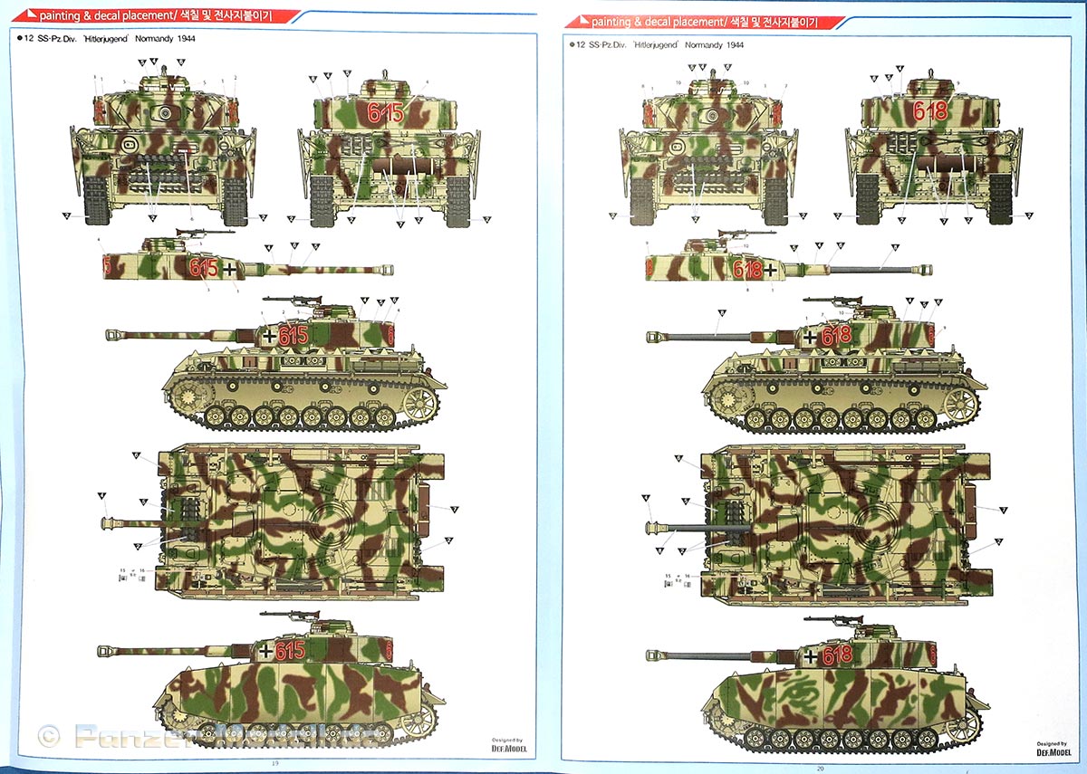 Die Bauanleitung besteht interessanterweise aus drei einzelnen Bauanleitungen bestehen, die als Teil 1, 2 und 3 bezeichnet sind und insgesamt 31 Bauschritte beinhalten. Teil 1 und 2 zeigen in schwarzweißen, großen und gut verständlichen Zeichnungen den Bau von Wanne und Turm, Teil drei ist farbig gedruckt und zeigt von den Baustifen nur noch das Anbringen des Fla MGs und das Aufsetzen des Turms. Der Rest von Teil 3 zeigt genau welche Zimmerit Decal Teile auf welche Bauteile gehören, sowie drei ganzseitige Mehrseitenansichten in Farbe zur Bemalung und Markierung. Vorgeschlagen werden drei Fahrzeuge der 12.SS-Pz.Div. "Hitlerjugend" in der Normandie 1944 mit leicht variierenden Driefarbtarnschemen in dunkelgelb olivgrün und rotbraun. Unterschiedlich sind nur die Turmnummern "615" und "618" in rot/weiß, sowie "635" in schwarz/weiß"