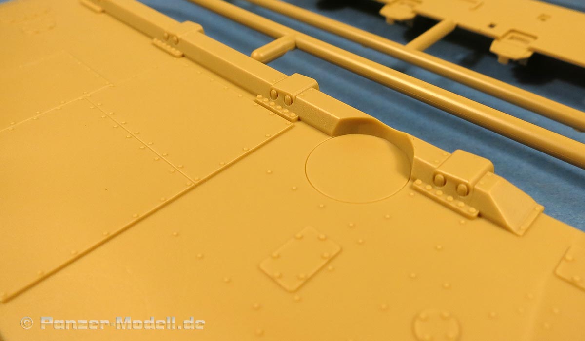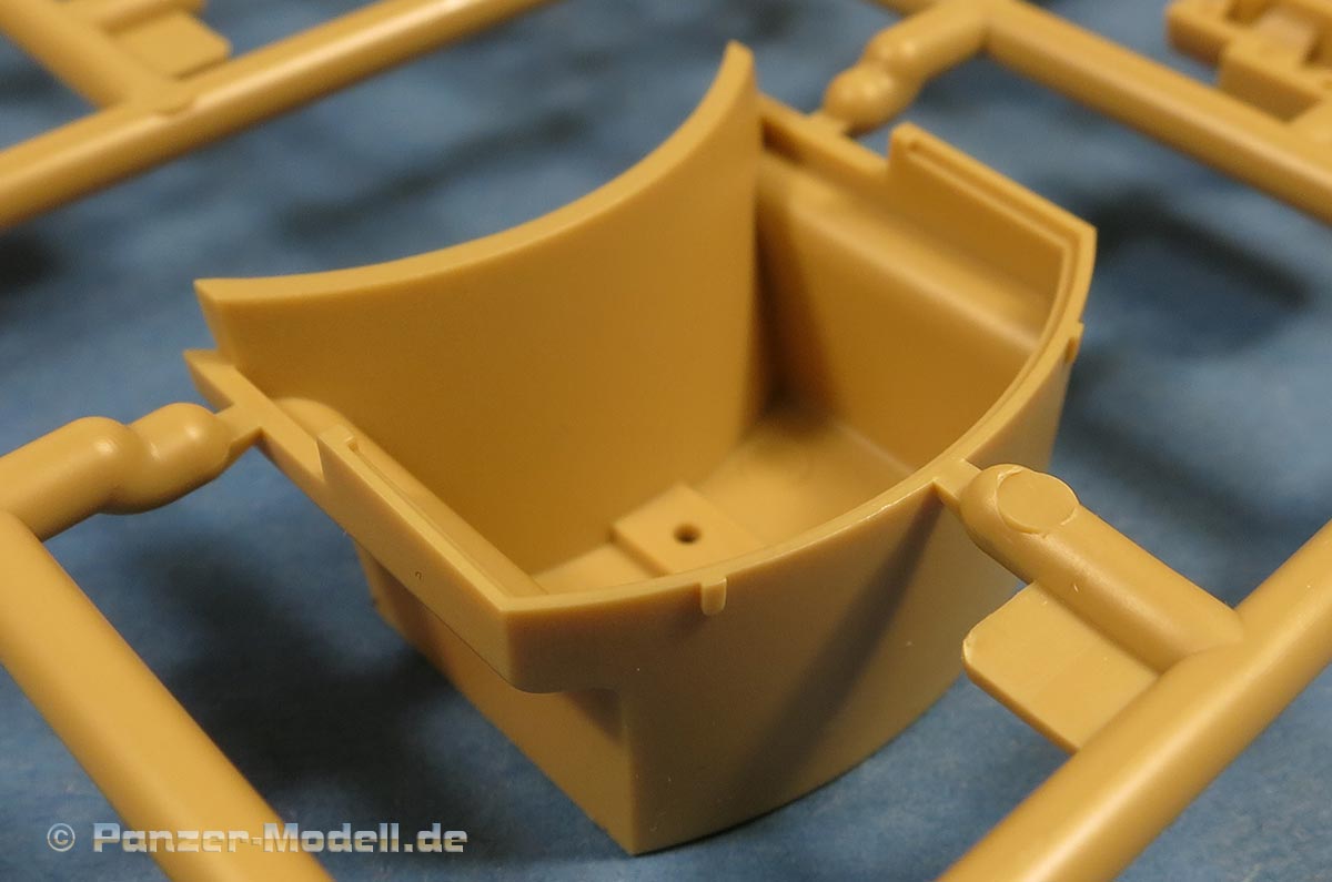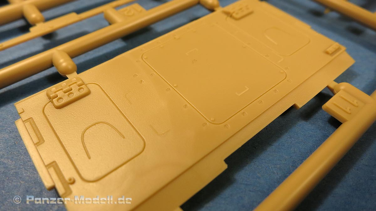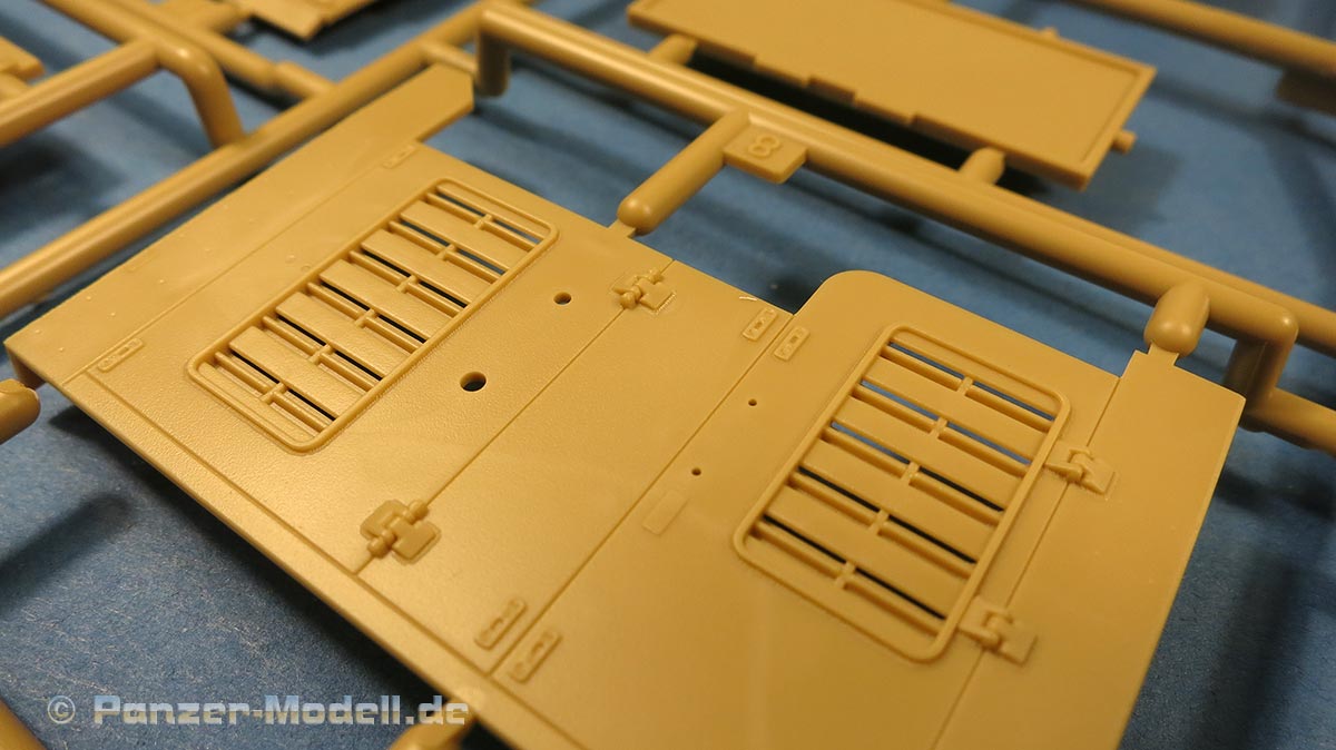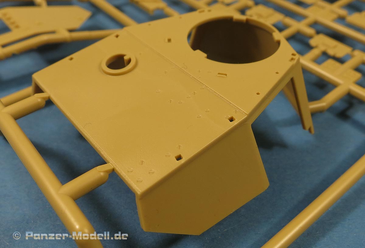 Die Oberwanne ist grundsätzlich einteilig mit anzusetzendem Motordeck. Für das Blech mit Fahrer- und Funkerluke liegen zwei (eigentlich sogar drei) optionale Teile bei.