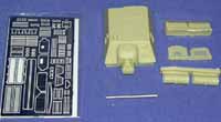 Der Umbausatz beinhaltet 7 Resinteile, 89 PE-Teile und ein gedrehtes Alu-Rohr. Die Resinteile sind sauber gegossen, wobei der Aufbau in einem großen Block gegossen ist, und einen Riesen-Anguß unten besitzt ... sägen ist also angesagt. Dazu kommen noch zwei Staukisten, zwei Zusatztanks am Heck und zwei Teile für eine Kanonenblende. Schon jetzt eine Anmerkungzur Kanonenaufnahme, der Kragen auf der Front ist nicht ganz korrekt wiedergegeben und müsste mit Sheet erweitert werden (Originalbilder zurate ziehen!). Die Ätzteile sind umfangreich und bieten viele Detailierungen wie Scharniere und Halterungen, sowie Lüftergitter und neue Heck- und Frontkotflügel.