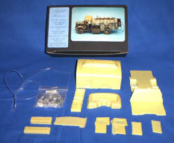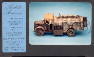 für jedes Flugplatz oder V-2 Diorama - die Opel Kesselwagen. Der kleine britische Hersteller "Airfield" bietet unter anderem einen recht schönen Resin Umbausatz für das Kfz. 385 an. Der 72,50 DM teure Umbausatz beinhaltet neben dem Kesselaufbau auch die Teile für den offenen Fahrerraum inkl. Abdeckplane. Was den Airfield Bausatz von den meisten anderen Umbausätzen des Kfz. 385 unterscheidet, ist die Tatsache, daß der Aufbau offen dargestellt werden kann. Beide Seitenkästen können geöffnet werden, ebenso der hintere Zugang zur Pumpanlage. Letztere liegt dem Umbausatz als seperate Tüte aus Weissmetallteilen bei und ist sehr gut detailliert. Die Resinteile sind sauber und verzugsfrei gegossen, lediglich die Angüsse müssen versäubert werden. Neben Resin- und Metallteilen liegt dem Modell auch ein Vinylschlauch für die Tankanlage bei.
