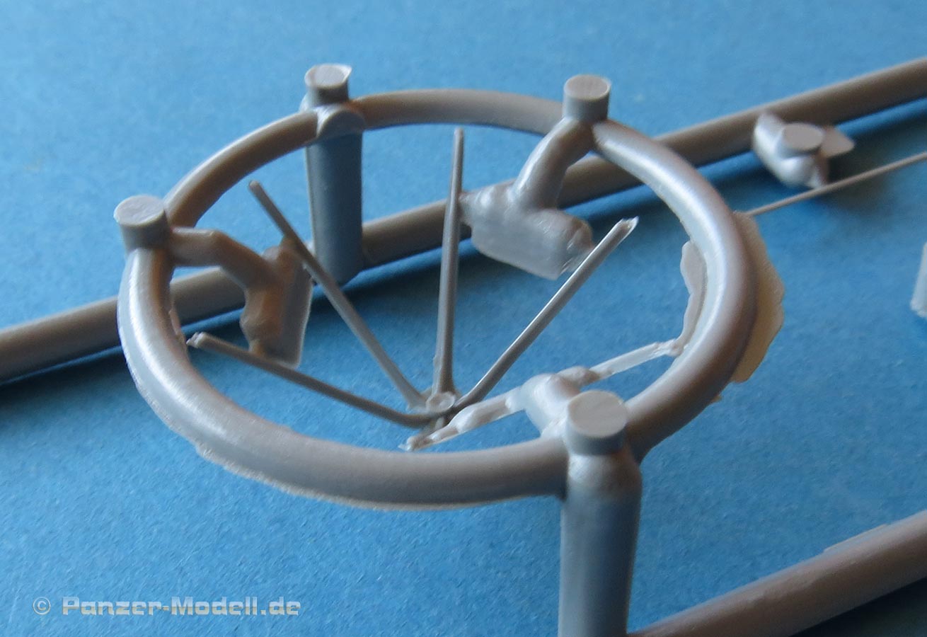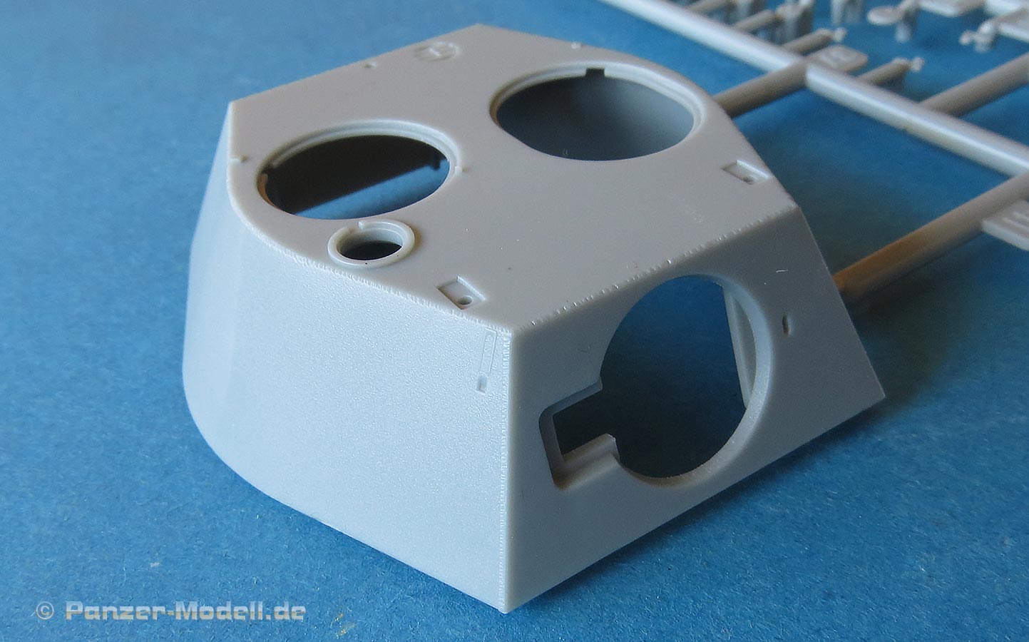 Der Turm setzt sich im groben aus dem Turm Ober- und Unterteil zusammen, an sie auch noch so maches Einzelteil verbaut werden muss. Die Schweißnähte am Turm sind recht fein und machen einen guten Eindruck. Im Inneren natürlich die Kanone, die dort komplett mit Verschluss dargestellt ist und höhenbeweglich in den Haltering eingebaut wird. Die Kanonenblende und das Rohr der 5cm KwK sind einteilig, was gerade beim Rohr erfreulich ist. Die Münsungsbremse setzt sich dabei aus drei Teilen zusammen, wobei sie dabei im Hauptkörper einteilig ist und nicht wie sonst der Länge nach halbiert. Sie wird nur durch einen UInnenring und die vordere Abschlussplatte vervollständigt. Die Nebelwurfbecher an den Turmseiten kommen einzeln daher und sind recht fein und hohl gespritzt und können nach Gusto einzeln befüllt werden. Die beiden Luken für die Turmcrew liegen einzeln bei und können offen oder geschlossen gebaut werden. Für den Turm liegt eine Stabantenne und für das Motordeck eine Sternantennen aus Spritzguss bei, die recht ansehnlich sind, aber natürlich gegenüber Metallantennen keine Chance haben.