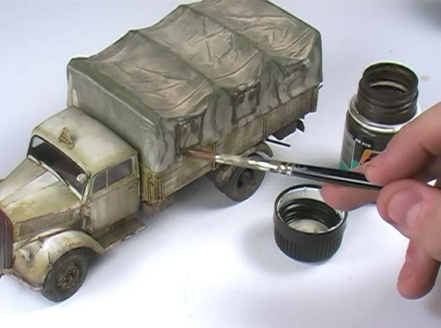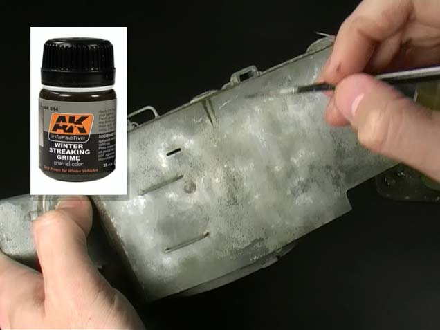 Auch geht es dann weiter mit der weiteren Verfeinerung des Winteranstrichs, weitere Abnutzungen, Filter, Washings, etc. Gezeigt wird auch die vielgerühmte Schwammmethode zur großflächig angedeuteten Abnutzung von Farbaufträgen.