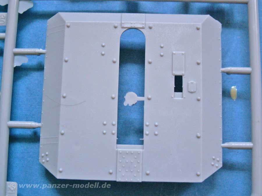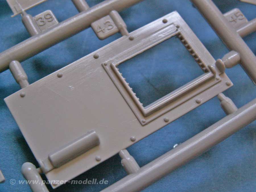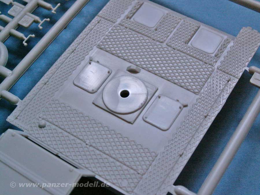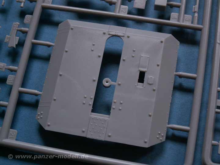 Die Wanne, die aus mehreren teilen zusammengebaut werden muss) und der Aufbau zeigen gute Detailierung und feine Strukturen, wie z.B. die Nieten und Ösen am Aufbau, die ich gelungen finde! Die Fahrerluke (übrigens in korrektem Fahrererker) kann geöffnet dargestellt werden, leider fehlt aber eine Innenausstattung für den Fahrerraum. Dafür ist die "Inneneinrichtung" des Kampfraumes ordentlich und ausreichend. Mitgeliefert werden noch 10 Granaten, die allerdings mei ner Meinung nach nicht genügend Details aufweisen.