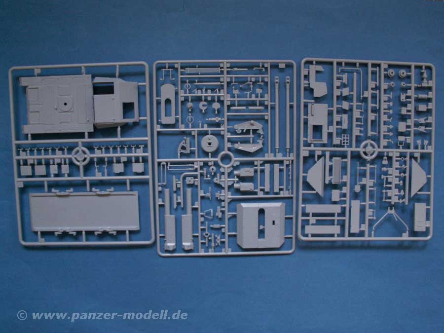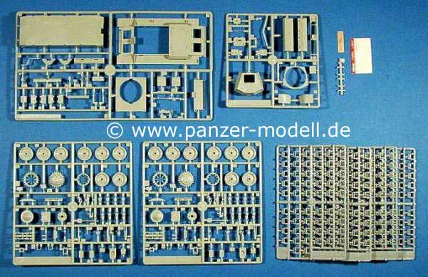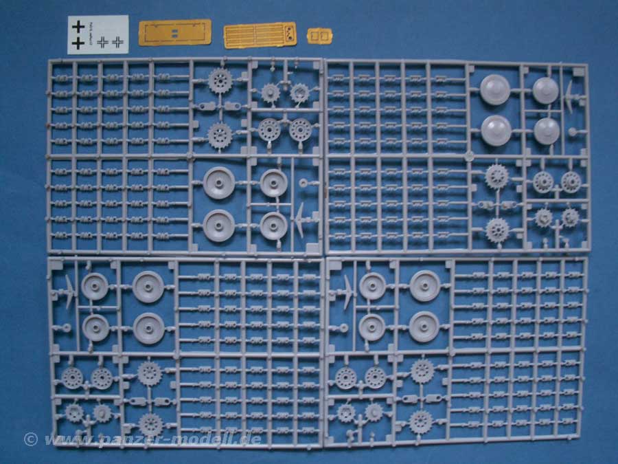 Der Bausatz an sich enthält 7 Spritzlinge, ein paar PE Teile und Decals, wobei 4 Spritzlinge auf Kette und Laufwerk entfallen. Ein Spritzling ist direkt aus dem 8,8cm PaK Bausatz von Alan. An den restlichen beiden Spritzlingen findet sich die Wanne mit sämtlichen Anbauteilen.