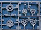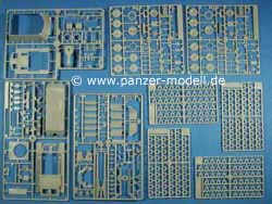 7 Spritzlinge, von denen 4 Auf das Laufwerk und Einzelkettenglieder entfallen. Diese machen soweit einen passablen Eindruck, benötigenaber sicher nach dem Heraustrennen einiges an Versäuberung. Die Teile an sich sind von der Qualität und Detailierung wie man es von Alan kennt ... nichts herausragendes, aber durchaus im guten Bereich. Sogar zwei kleine PE Teile gibt es für das Auspuffgitter und die Lufteinlassschlitze. Insgesamt machen die Teile einen stimmigen Eindruck und es sind auch alle Teile da, die man benötigt, sogar eine Inneneinrichtung ist vorhanden und darüberhinaus auch Zubehör wie Granaten, Kartuschen und Kartuschenkisten. Einziges Manko das mir ins Auge stach, waren die Speichenräder des sIG, wo an sich die gepressten Räder in dieser Version zu finden waren, sowie die falsche Plazierung der Schießtabelle, die an die linke Aufbauwand gehört.
