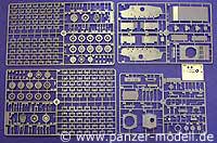 Die Qualität der Teile ist Ansichtssache. Während die Teile der 8,8cm durchaus nett anzusehen sind und auch nette Details aufweisen und auch die Kette recht angenehm erscheint, so sind die Räder zwar nicht schlecht, die Detailschärfe der Nieten erschint etwas weich. Die Struktur der Oberwanne mit den Riffelblechen ist doch arg grob, wobei an anderen Teilen die Details wieder schön erscheinen, wie etwa der Lüfter mit den einzelnen PE Lamellen auf dem Frontblech. Schön ist auch die Beigabe von Innenausstattung wie etwa dem Fahrerplatz!