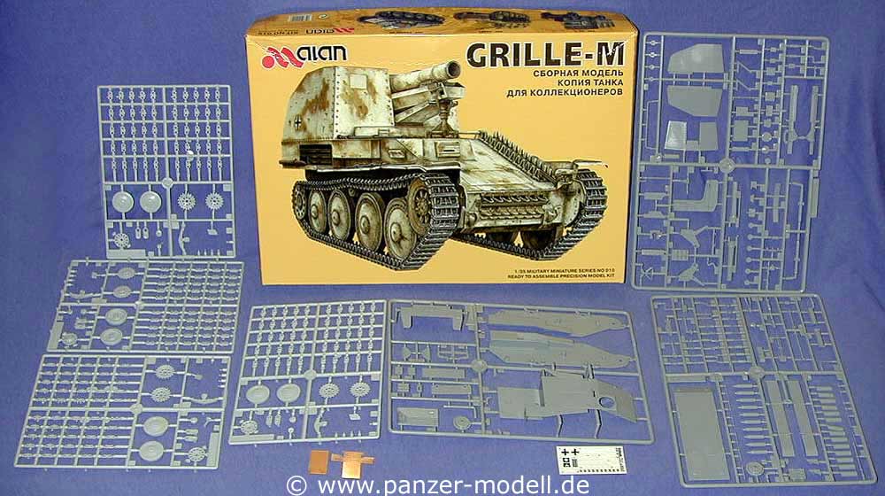 Ein Blick in die Schachtel zeigt uns das übliche grue Plastik von Alan, verteilt auf 7 Spritzlinge, wovon 4 für Ketten und Räder sind. Die anderen Spritzlinge enthalten die Wanne und Aufbau für die Grille, sowie die sIG33, die man ja schon aus dem Alan Programm kennt. Die Qualität der Teile sieht zufriedenstellend aus, hier und da sind aber unglückliche angüsse und Auswerferstellen an dern Teilen. Die Räder haben die korrekte Anzahl an Nieten, diese sind aber leider ein bisschen grob ausgefallen, was aber nicht weiter stört. Die Kettenglieder sind gut detailliert, so wie es aussieht muss man beim Heraustrennen aber vorsichtig sein, dass amn die äusseren Stege dabei nicht zerbricht. Bei meinem Bausatz haben leider viele Kettenglieder Plastikaustritte, wo die Form offenbar nicht richtig zusammensass. Das erfordert einiges an Nacharbeit!