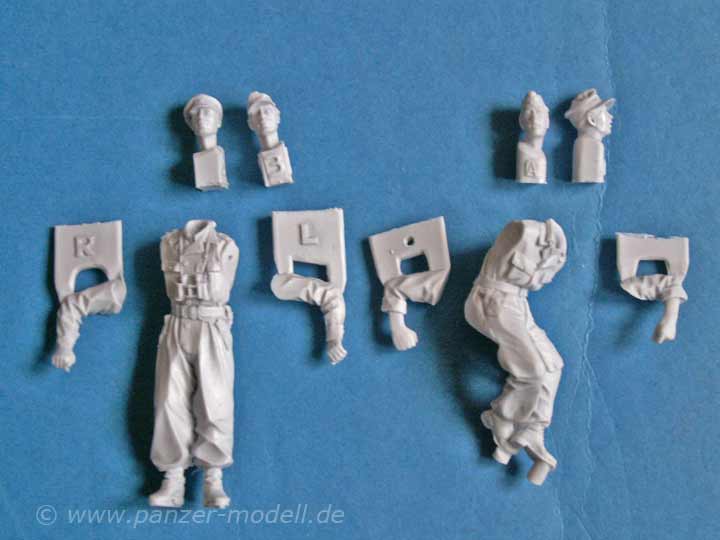 Beides sind Vollfiguren, denen nur noch Köpfe und Arme angeklebt werden müssen und weisen eine gut wählte Haltung auf, die sie mit der Wahl der Köpfe zu individuellen Schönheiten macht - gerade die eine Figur, die leicht sitzend modelliert ist, macht sich in vielen Sizuationen auf einem Panzer gut und bringt Leben mit hinein.