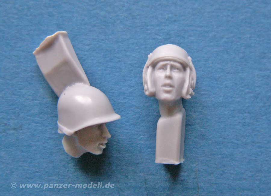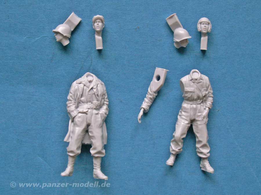 Beide Figuren bestehen aus angenehm wenigen und sehr gut geossenen Teilen aus Resin. Der Körper ist dabei nahezu komplett gegossen - bei einer Figur muss nur noch der Kopf, bei der anderen der Kopf und ein Arm angeklebt werden. Dies ist angenehm und modellbaufreundlich. Natürlich gibt es für beide Figuren wieder die Auswahl von jeweils zwei verschiedenen Köpfen. Diese sind entweder mit Stahlhelm oder Panzerkappe bzw. Feldmütze ausgestattet.