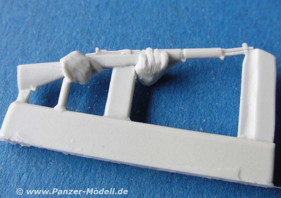 Für beide Figuren sind Waffen enthalten, die jeweils die Hand, bzw. Hände bereits am Gewehr angegossen haben.