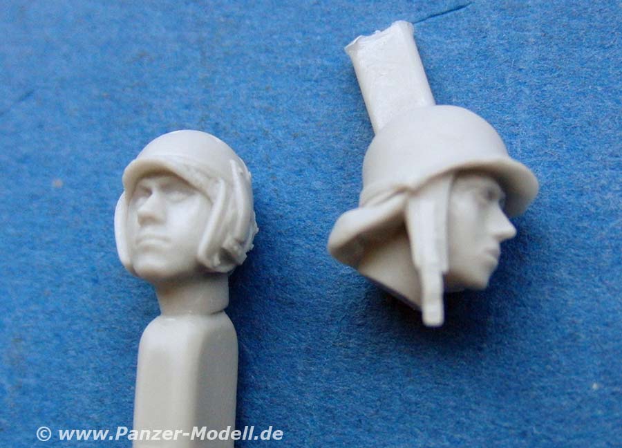 Für beide Figuren liegen zwei verschiedene Köpfe zur Auswahl bei. Diese sind jeweils mit Helmen und Mützen ausgestattet. Die Gesichter sind ausdrucksstark modelliert und fein detailliert gegossen.