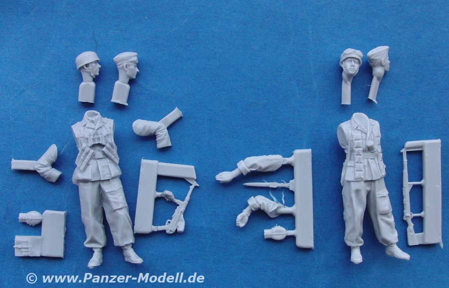 Für beide Figuren liegen wahlweise je zwei Köpfe bei - natürlich jeweils mit Fallschirmjäger Helm und jeweils mit Schiffchen. Je ein Kopf mit Schiffchen und Helm hat dabei eine hochgeschobene Staubschutzbrille, die das Erscheinen noch etwas auffälliger macht.