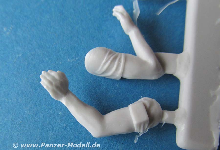 Beide Figuren sind quasi komplett gegossen. Bei beiden müssen lediglich noch Kopf und Arme angeklebt werden, wobei bei der sitzenden Figur sogar nur noch ein Arm angeklebt werden muss. Wie gewohnt liegen für jede Figur 2 Köpfe zur Auswahl bei. Diese sind sehr schön modelliert und bieten für die "stehende" Figur je einen Kopf mit dem Panzerhelm mit darunterliegenden Kopfhörern, einmal mit, einmal ohne Staubschutzbrille. Die sitzende Figur hat auch einen Kopf mit Panzerhelm und einmal mit normalem US Gefechtshelm. Für die Mikrophone liegt jeder Figur ein feines Resinteil bei