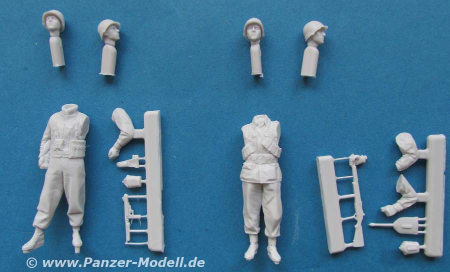 Beide Figuren sind ebenfalls einzeln unter den Nummern 35184 und 35185 erhältlich. Die Figuren setzen sich jeweils aus mehreren Teilen zusammen. Grundsätzlich ist der Körper in einem Stück gegossen an den jeweils die Arme und der Kopf angeklebt werden müssen. Wie von Alpine gewohnt, liegen für jede Figur zwei Köpfe zur Auswahl bei. Beide Köpfe haben den typischen US Infanteriehelm auf. Die Darstellung der Gesichter ist sehr gut gelungen mit feinen Details. Auch der Rest der Figuren weist eine sehr schöne Gussqualität auf - der Faltenwurf der Kleidung ist sehr gut und realistisch. Auch hier hat man den Figuren wieder tolle Details spendiert. Über den Uniformjacken werden verschiedene Magazintaschen getragen, die einen exzellenten Eindruck machen. Von den Posen her sind beide Figuren in locker stehender Haltung, wie man es von Alpine gewohnt ist. Ein nettes Set zur Bereicherung einer Szene. Für rund 27 Euro bekommt man hier ein schönes und qualitativ hochwertiges Set.