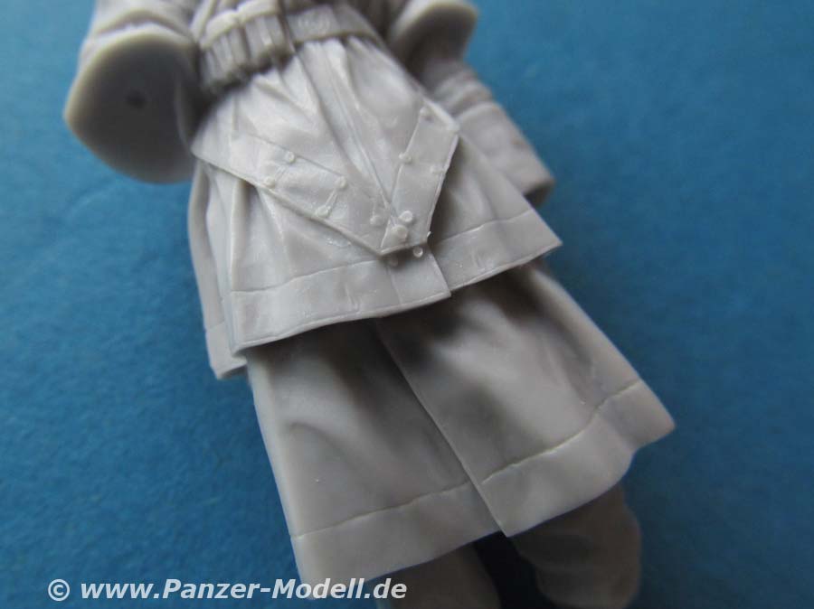 Die eine Figur hat einenlangen Wintermantel mit übergezogenem Smock. Die Hände sind mit Hadschuhen geschützt. Unter den Gürtel ist eine Stielhandgranate eingeschoben, die hier direkt mit eingegossen ist. Die linke Hand trägt einen MG Gurtkasten