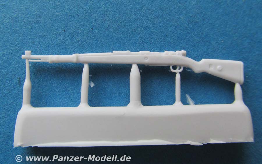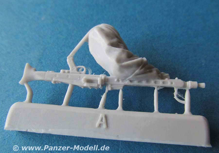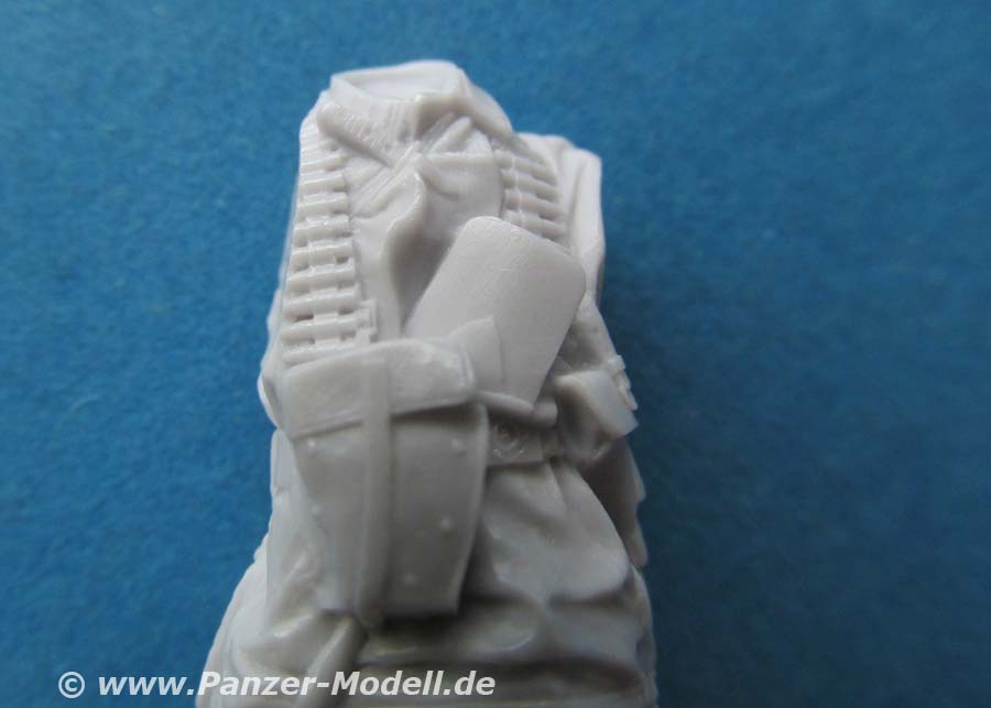 Dei andere hat die SS Uniform Wendejacke an, hat einen MG Gurt umgehängt, den Klappspaten eingeschoben und die MG Zubehörtasche vorn vorm Gürtel. Alle diese Teile sind bereits auf die Figur mit angegossen und machen einen exzellente Eindruck! Der rechte Arm wird einzeln angeklebt und hat das MG bereits mit angegossen und zwar so, dass der Unterarm auf dem umgehängten MG ruht. Alles sehr fein, sehr detailliert und absolut fehlerfrei gegossen.