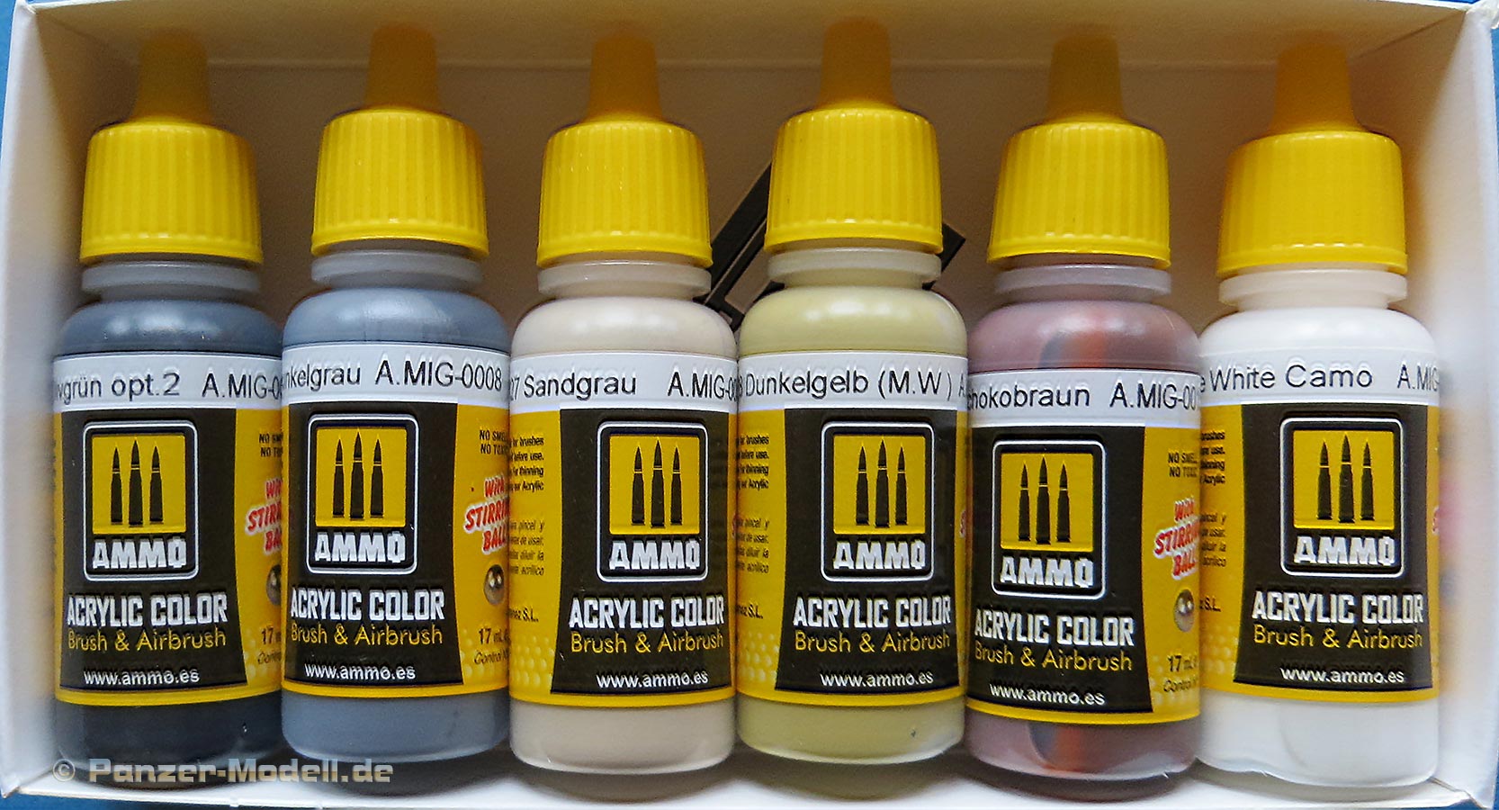 Mit diesen Farbtönen kann der geneigte Modellbauer den Großteil der möglichen Tarnschemen der frühen Fahrzeuge von 1939 bis 1943 realisieren - begonnen mit den einfarbigen Schemen in dunkelgrau über Farbschema in Afrika, Wintertarnungen, dunkelgelb einfarbig und frühe Dreifarbtarnungen. Die Farben können sowohl mit dem Pinsel als auch mit der Airbrush verarbeitet werden. Je nach Airbrush Typ können diese unverdünnt oder nachverdünnt verwendet werden. Die Qualität der Farben ist ganz ausgezeichnet mit sehr feiner Pigmentierung und einem schwach seidenmatten Ton, der realistisch in diesem Maßstab wirkt. In jeder Flasche befindet sich bereits eine Stahlkugel, mit der man die Farbe schnell und einfach effektiv aufschütteln kann. Die Farben sind wasserlösliche Acrylfarben und nicht giftig. Ein ideales Set für den Wehrmachtsmodellbauer, der farbmäßig neu in dieses Thema einsteigt und hiermit eine solide Basis bekommt. Special thanks to Ammo of Mig for the sample.