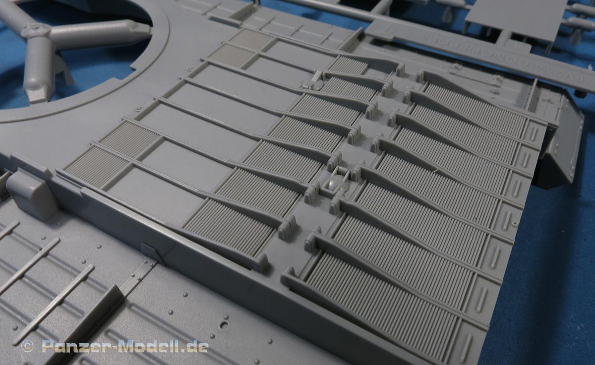 Die Oberwanne besteht auch im Groben aus einem großen Einzelteil, in das vorn die Bug- und die Fahrerabdeckplatte eingesetzt werden - diese haben tolle Details mit der feienn Darstellung z.B. einer Gussnummer. Diese Oberwanne zeigt jedenfalls alle korrekten Details einer Mk.I wie die drei Winkelspiegel für den Fahrer oder den nach aussen versetzte Tankstutzen am Motordeck hinten und nicht in den Motorluken wie bei der Mk.II (die Dragon auch prompt vergessen hatte). Sehr schön und insbesondere korrekt sind die Lüfteröffnungen in allen Motorklappen dargestellt mit der richtigen Anzahl bzw. entsprechend feinen Darstellung der Lamellen.