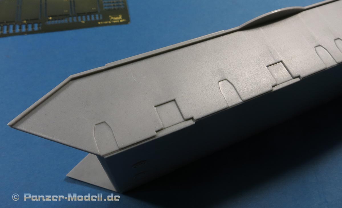 Die Teile, die dann den Conqueror zum Super Conqueror machen, sind die brandneuen PE Teile - diese umfassen die Zusatzpanzerbleche und die feinen, filigranen, kleinen Haltebolzen. Die PE Teile sind sehr sauber und fein geätzt - die Bleche für den Turm sind einteilig und werden entsprechend geknickt.